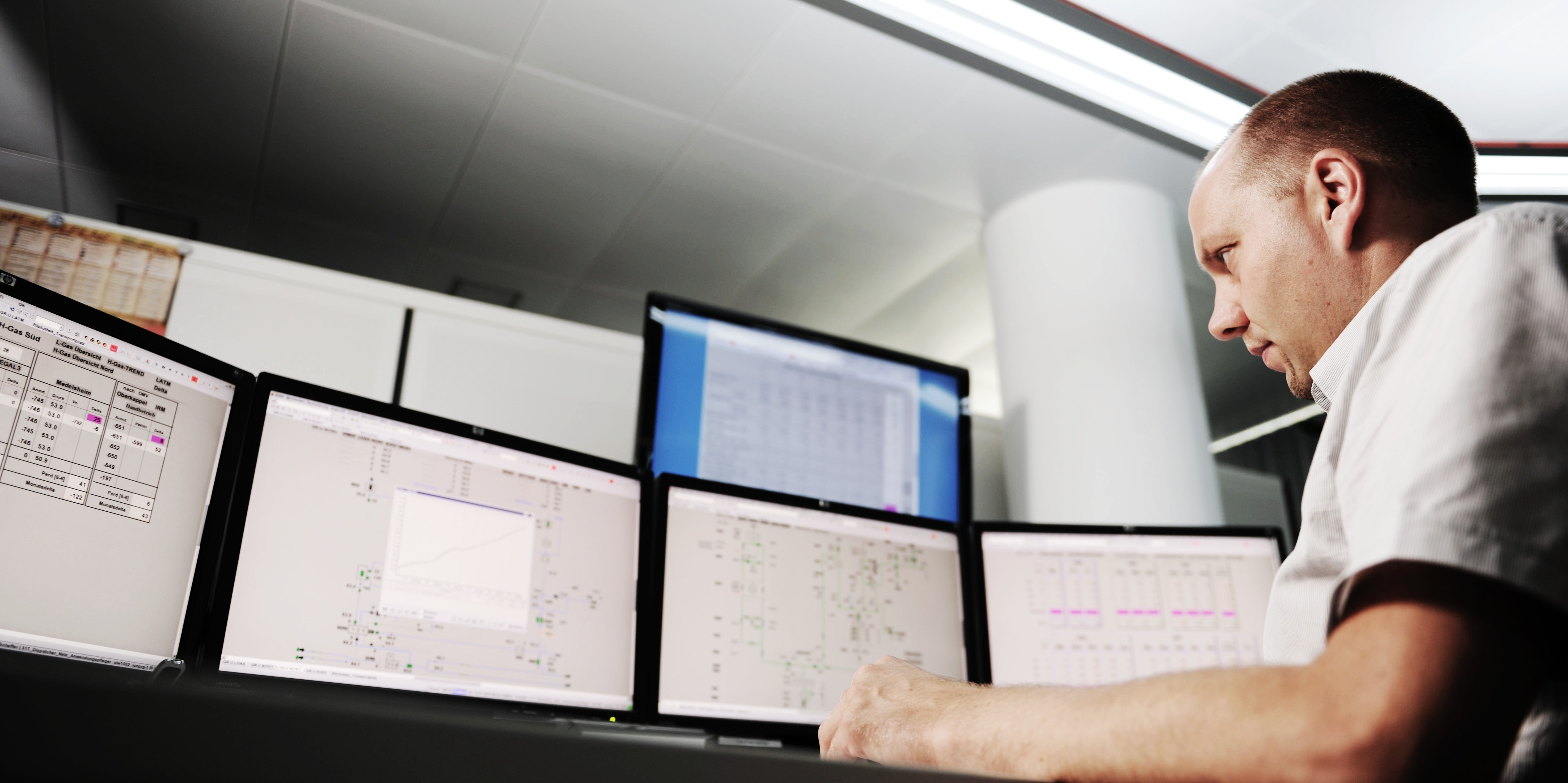 Für Sie stellen wir eine 24/7-Bereitschaft für die Netzsteuerung gemäß DVGW G1000. Wir steuern den Gasdruck und die Durchflussmengen auf Basis modernster, leistungsstarker Kontroll- und Steuerungssysteme. Auch die Gasbeschaffenheiten, Volumenströme und Druckparameter überwachen wir in Ihrem Auftrag.