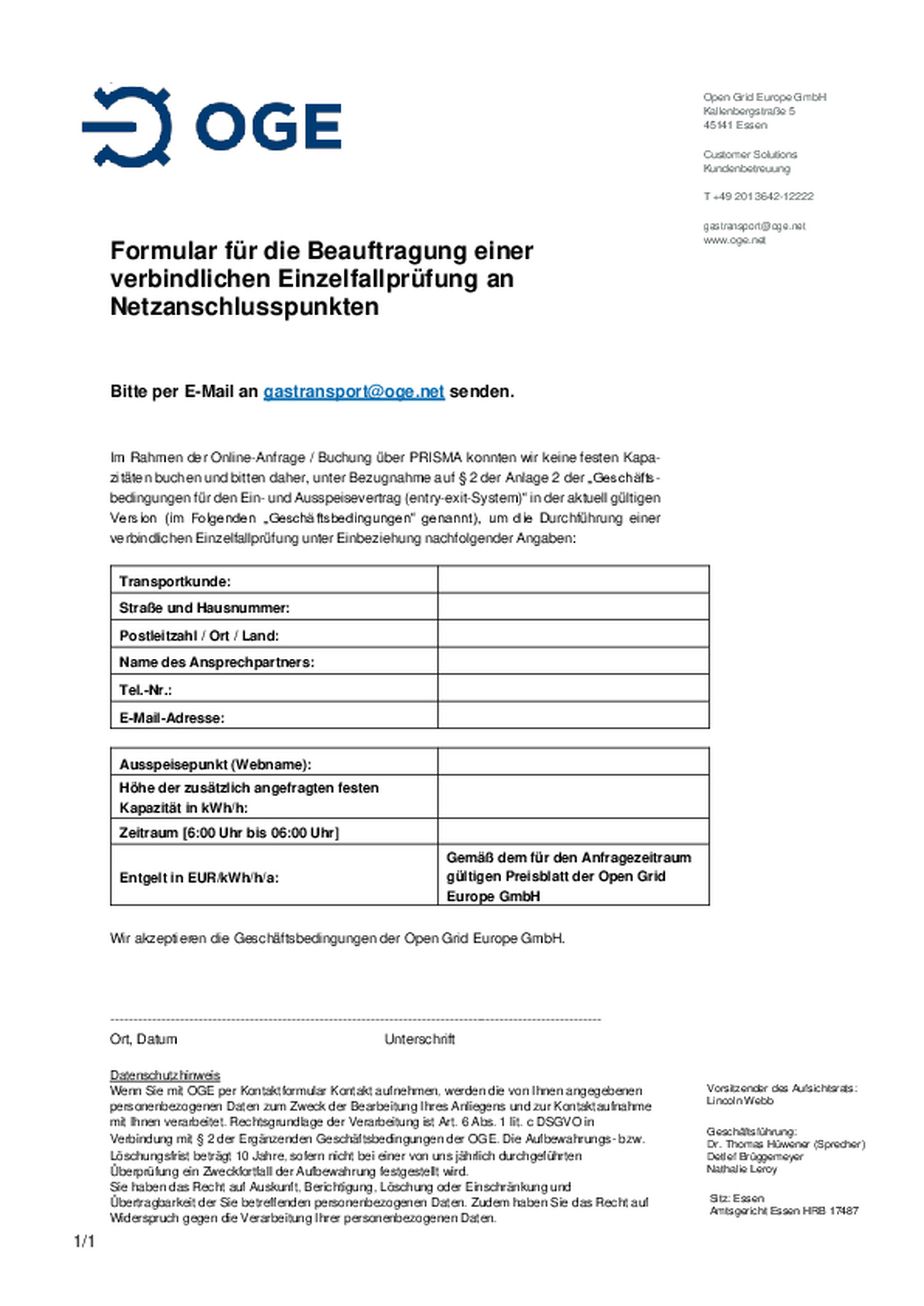 Im Rahmen der Online-Anfrage / Buchung über PRISMA konnten wir keine festen Kapazitäten buchen und bitten daher, unter Bezugnahme auf § 2 der Anlage 2 der „Geschäfts- bedingungen für den Ein- und …Ausspeisevertrag (entry-exit-System)“ in der aktuell gültigen Version (im Folgenden „Geschäftsbedingungen“ genannt), um die Durchführung einer verbindlichen Einzelfallprüfung unter Einbeziehung nachfolgender Angaben.