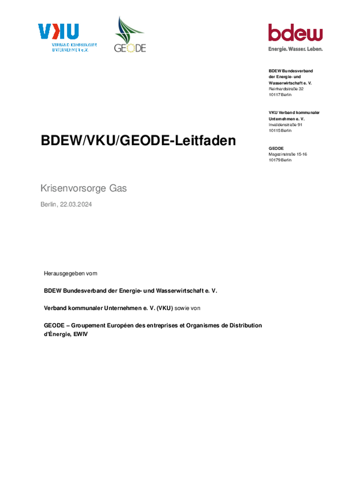 Der BDEW/VKU/GEODE-Leitfaden „Krisenvorsorge Gas“ beschreibt in erster Linie prozessuale Abläufe, damit verbundene Informationspflichten und Kommunikationswege. So sollen Maßnahmen nach § 16 und § 16a Energiewirtschaftsgesetz (EnWG) optimal umgesetzt werden, vor allem zwischen vorgelagerten und nachgelagerten Netzebenen. Mit dem Leitfaden werden die Anforderungen des § 21 Systemverantwortung der Kooperationsvereinbarung Gas (KoV) konkretisiert – und so sollten sie auch zwischen allen Netzebenen umgesetzt werden.