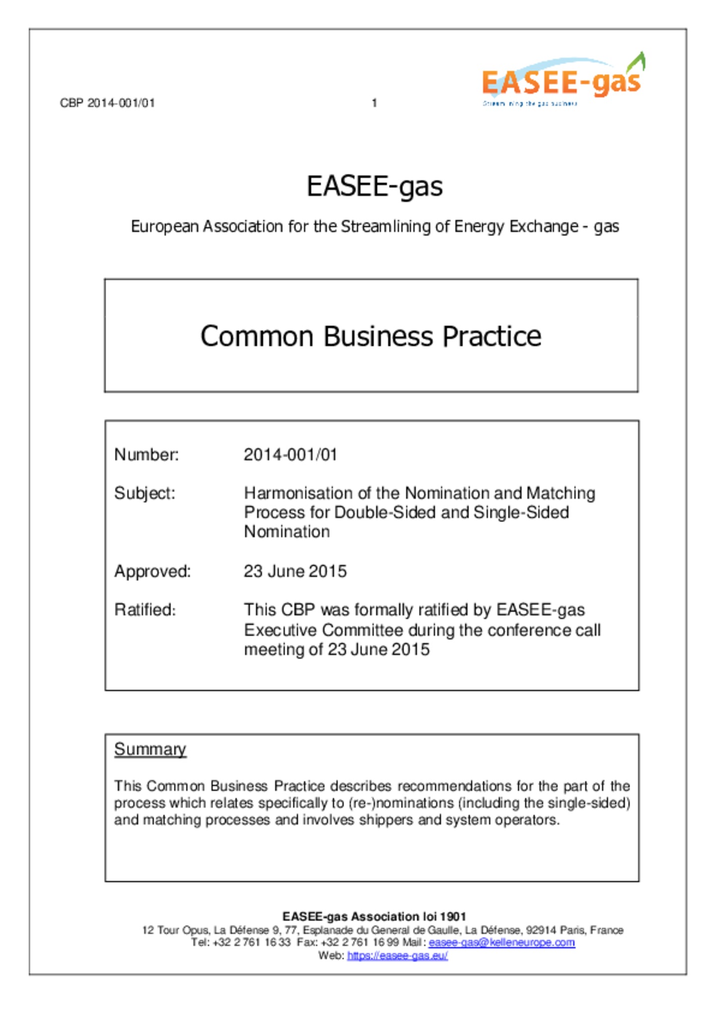 CBP (2014-001/01): Harmonisation of the Nomination and Matching Process for Double-Sided and Single-Sided Nomination: This following Common Business Practice CBP has been approved by EASEE-gas for use in gas business transactions across connection points and constitutes recommendations for the part of the process which relates specifically to (re-)nominations and involves shippers on one hand, and system operators on the other hand. This CBP reflects minimum requirements in line with the network codes, in the areas referred to in Article 8(6) of the Regulation (EC) 715/20091. This CBP does not exclude additional provisions between individual parties.