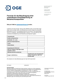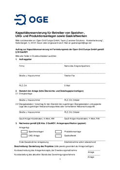 Open Grid Europe bietet seinen Transportkunden ein Formular zur effizienten Abwicklung von Anfragen nach § 38 GasNZV an. Durch die Verwendung des Formulars soll sichergestellt werden, dass Open Grid …Europe zeitnah über sämtliche Informationen verfügt, die für eine zügige Bearbeitung Ihrer Anfrage benötigt werden.