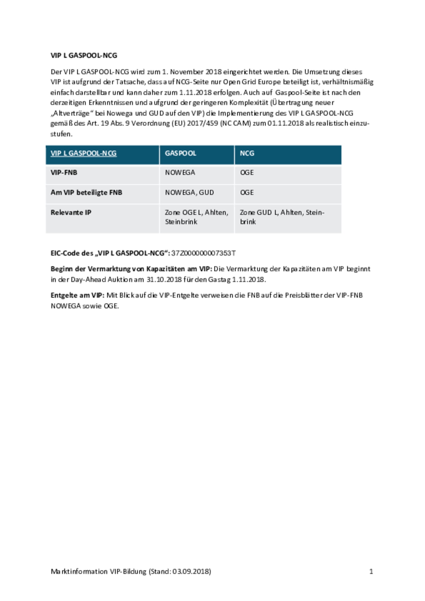 Der VIP L GASPOOL-NCG konnte zum 1. November 2018 eingerichtet werden. Die Umsetzung dieses VIP war aufgrund der Tatsache, dass auf NCG-Seite nur Open Grid Europe beteiligt ist, verhältnismäßig einfach darstellbar und konnte daher fristgerecht zum 1.11.2018 erfolgen. Auch auf Gaspool-Seite war aufgrund der geringeren Komplexität (Übertragung neuer „Altverträge“ bei Nowega und GUD auf den VIP) die Implementierung des VIP L GASPOOL-NCG gemäß des Art. 19 Abs. 9 Verordnung (EU) 2017/459 (NC CAM) zum 01.11.2018 erfolgreich.