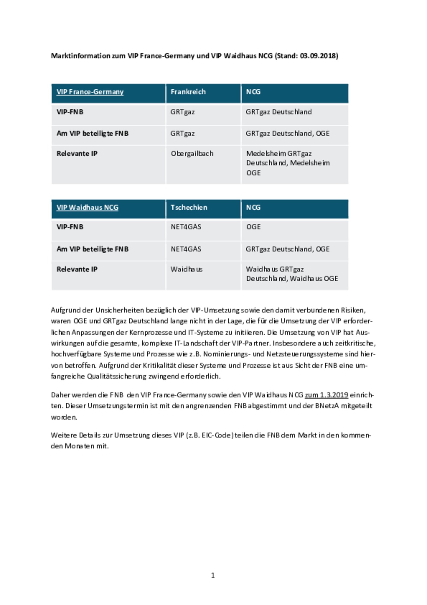 Die FNB konnten den VIP France-Germany sowie den VIP Waidhaus NCG zum 1.3.2019 erfolgreich einrichten. Dieser Umsetzungstermin ist mit den angrenzenden FNB abgestimmt und der BNetzA mitgeteilt worden.