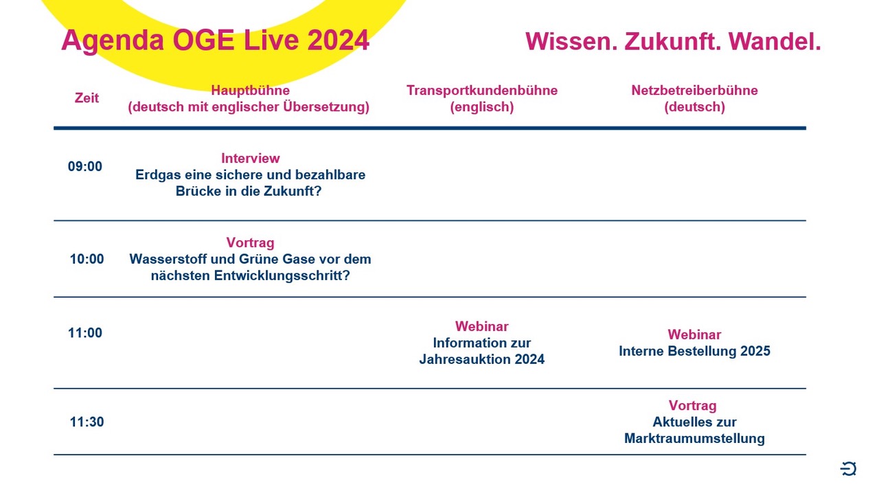 Wir verbinden praxisnahe Informationen über den aktuellen Gas- und Energiemarkt mit Hintergrundwissen. Bringen Sie sich bei OGE Live 2024 zu wichtigen Themen des Energiemarkts auf den neuesten Stand und diskutieren Sie mit!