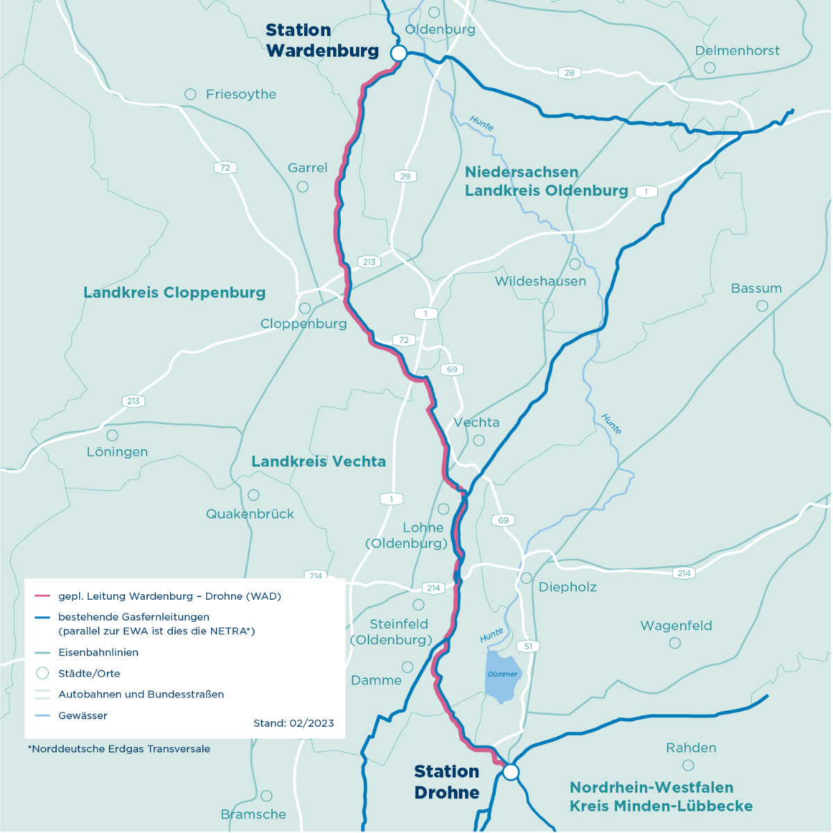 Ebenso wie der Leitungsabschnitt Etzel-Wardenburg unterstützt der Leitungsabschnitt Wardenburg-Drohne zukünftig die seit 1995 bestehende Erdgastransportleitung Norddeutsche Erdgas-Transversale (NETRA), um Erdgas aus den Niederlanden, Norwegen und Wilhelmshaven in das deutsche Ferngasnetz zu transportieren. Auch der Leitungsabschnitt Wardenburg-Drohne (WAD) ist für den Transport von Wasserstoff geeignet. Zudem dient der Leitungsabschnitt Wardenburg-Drohne der Umsetzung eines Pilotprojektes: Erstmalig finden auf einem Teilstück der 90 km langen Leitung CO₂-reduzierte Rohre ihren Einsatz.