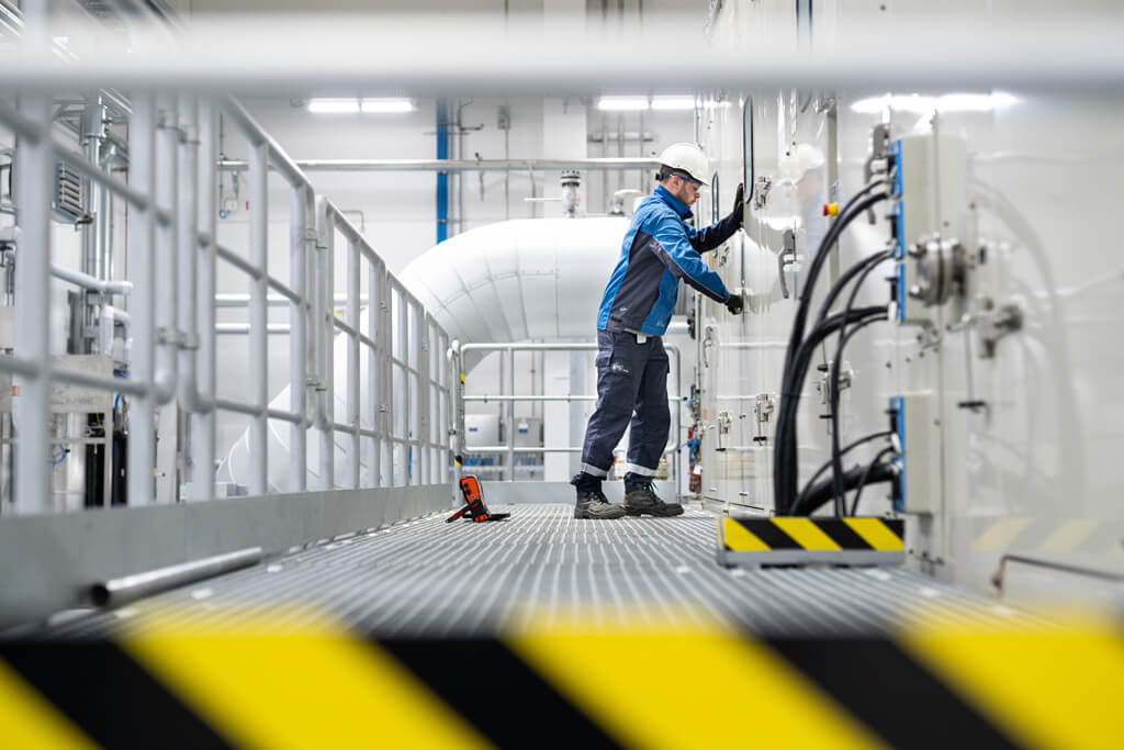 Zukünftig werden wir hier an unserer Station auch grünen Wasserstoff aus Windenergie erzeugen und speichern. Das ist das Projekt KRUH2. Dafür erhalten wir derzeit Wasserstoff-Grundlagenschulungen. Mit Erdgas kennen wir uns ja sehr gut aus, mit Wasserstoff müssen wir uns noch mehr vertraut machen. Im KRUH2-Projekt ist unsere Verdichterstation aktuell auch sehr interessant für Unternehmen mit Wasserstoff-Versuchsanlagen. Die besuchen uns und schauen sich an, wie wir das mit der technischen Umsetzung machen.
