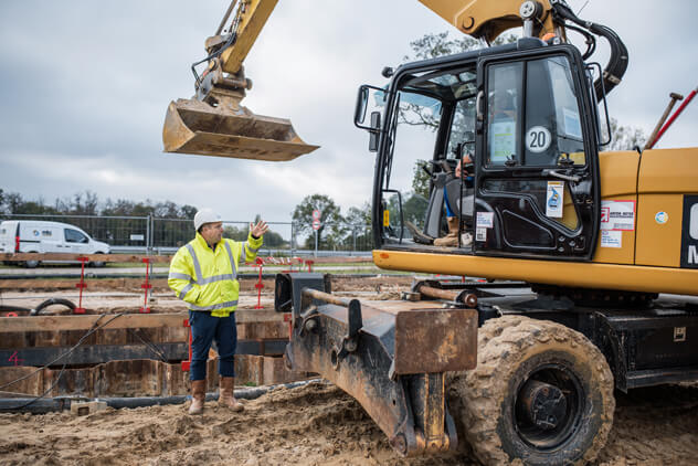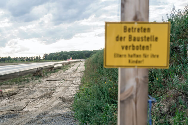 Unser Sicherheitsbeauftragter entwickelt bereits in der Planungsphase eine standardisierte Meldekette, die sofort und automatisch funktioniert, um notfalls kritische Situationen schnell zu entschärfen. Natürlich hat er dabei alle Beteiligten im Blick, aber besonders im Fokus stehen Situationen, in denen Außenstehende gefährdet werden können. Das geht bis hin zur Säuberung von Straßen, die unsere Baufahrzeuge überquert haben. Da müssen zum Beispiel Rückstände von Schlamm und Schotter beseitigt werden, um Gefährdungen von Außenstehenden zu vermeiden.