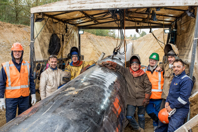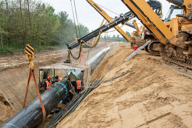 Am Bau einer Pipeline sind permanent zehn Gewerke gleichzeitig beteiligt. Meter für Meter bewegt sich die Baustelle vorwärts. Etwa 350 Meter am Tag. Die Planung ist immer drei bis sieben Tage voraus. Solch eine komplexe Baustelle funktioniert nicht mit Egoisten, hier ist gute Zusammenarbeit aller Gewerke gefragt. So sind bei uns nicht nur die Pipeline-Segmente verschweißt. Wir bilden auf der Baustelle ein eingeschweißtes Team. Eine kleine Familie erfahrener Kolleginnen und Kollegen, die sich blind aufeinander verlassen können.