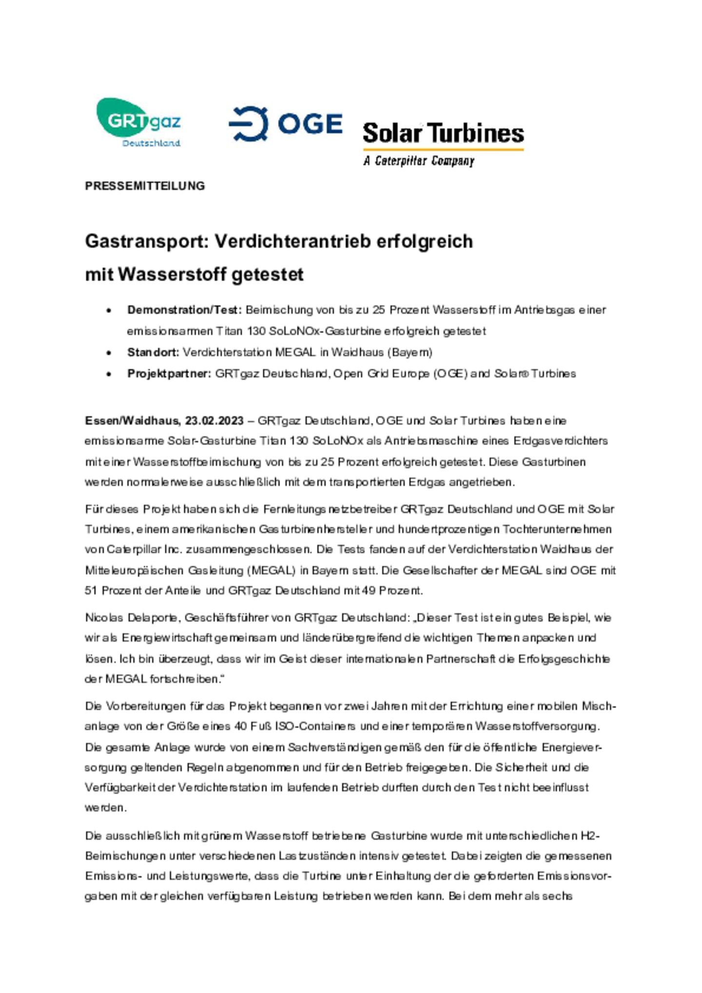 GRTgaz Deutschland, OGE und Solar Turbines haben eine emissionsarme Solar-Gasturbine als Antriebsmaschine eines Erdgasverdichters mit einer Wasserstoffbeimischung von bis zu 25 Prozent erfolgreich …getestet.