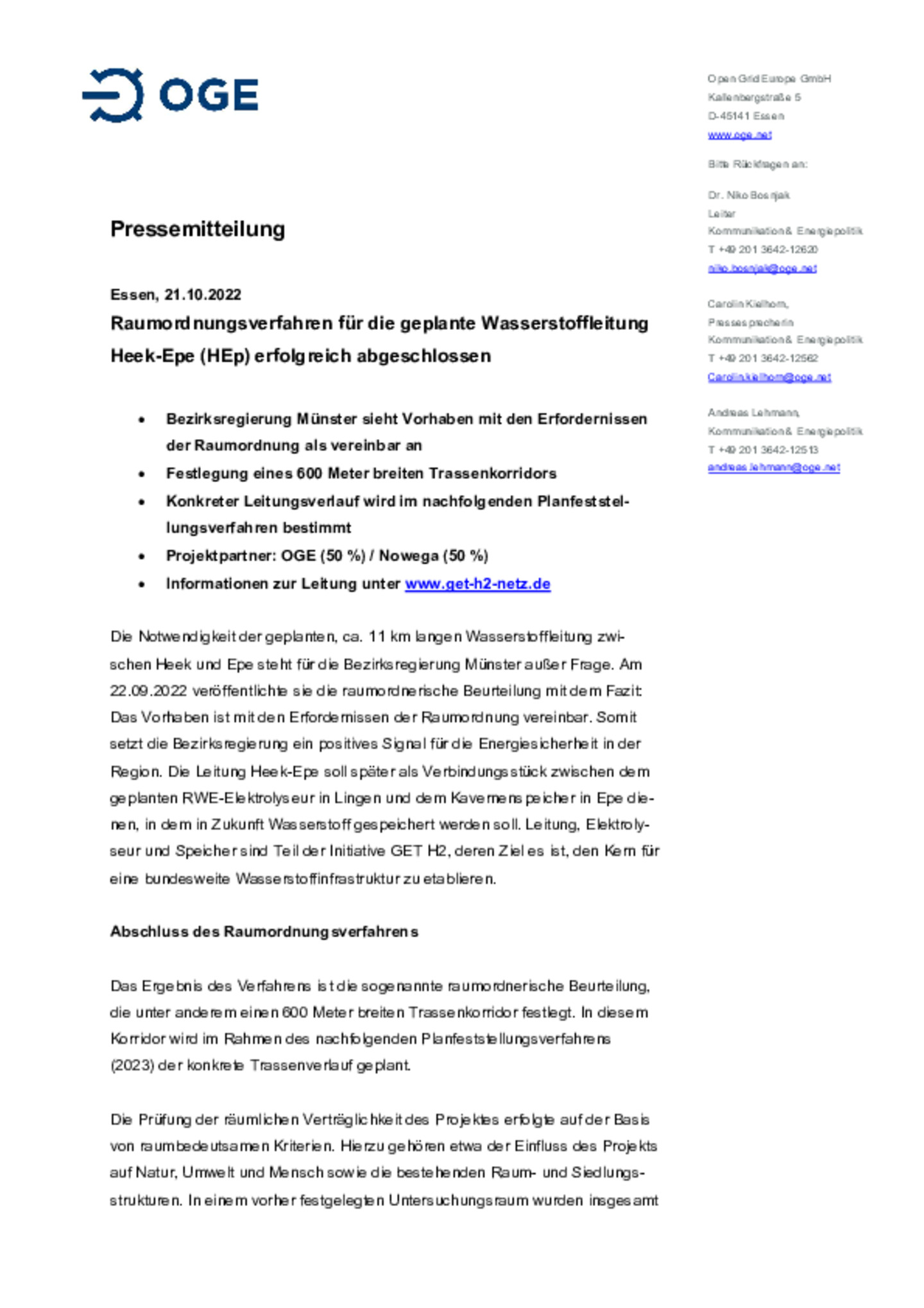 Raumordnungsverfahren für die geplante Wasserstoffleitung Heek-Epe (HEp) erfolgreich abgeschlossen