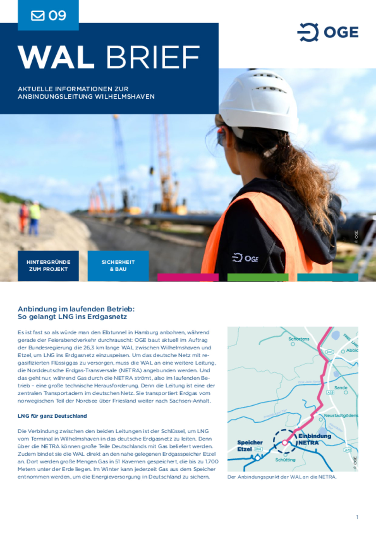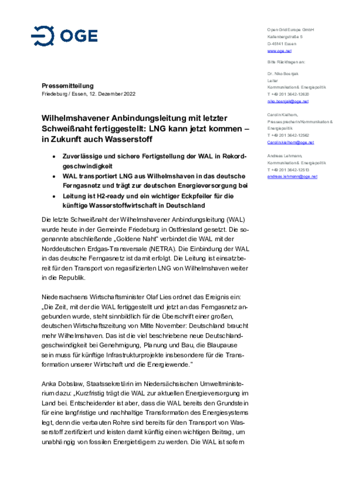 Zuverlässige und sichere Fertigstellung der WAL in Rekordgeschwindigkeit. WAL transportiert LNG aus Wilhelmshaven in das deutsche Ferngasnetz und trägt zur deutschen Energieversorgung bei. Leitung …ist H2-ready und ein wichtiger Eckpfeiler für die künftige Wasserstoffwirtschaft in Deutschland