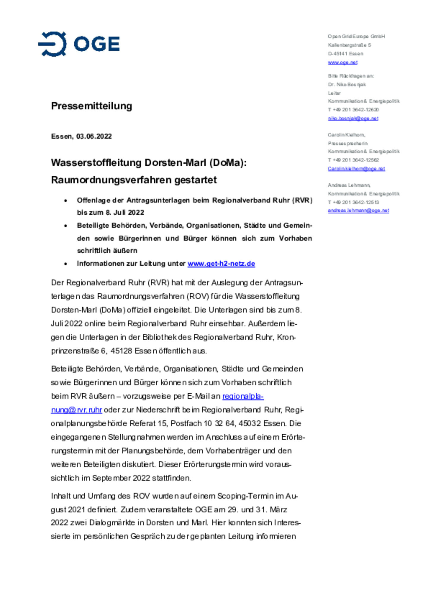Essen, 19.05.2022. Zur Erreichung der ambitionierten Klimaziele ist im Mobilitätssektor, vor allem im Güterverkehr, der Wechsel auf einen klimafreundlichen Treibstoff unumgänglich. Um diesen Wechsel …zu ermöglichen, haben das schweizerische Unternehmen H2 Energy Europe AG (H2 Energy) und die in Essen ansässige Open Grid Europe GmbH (OGE) eine Absichtserklärung über folgendes Konzept geschlossen.