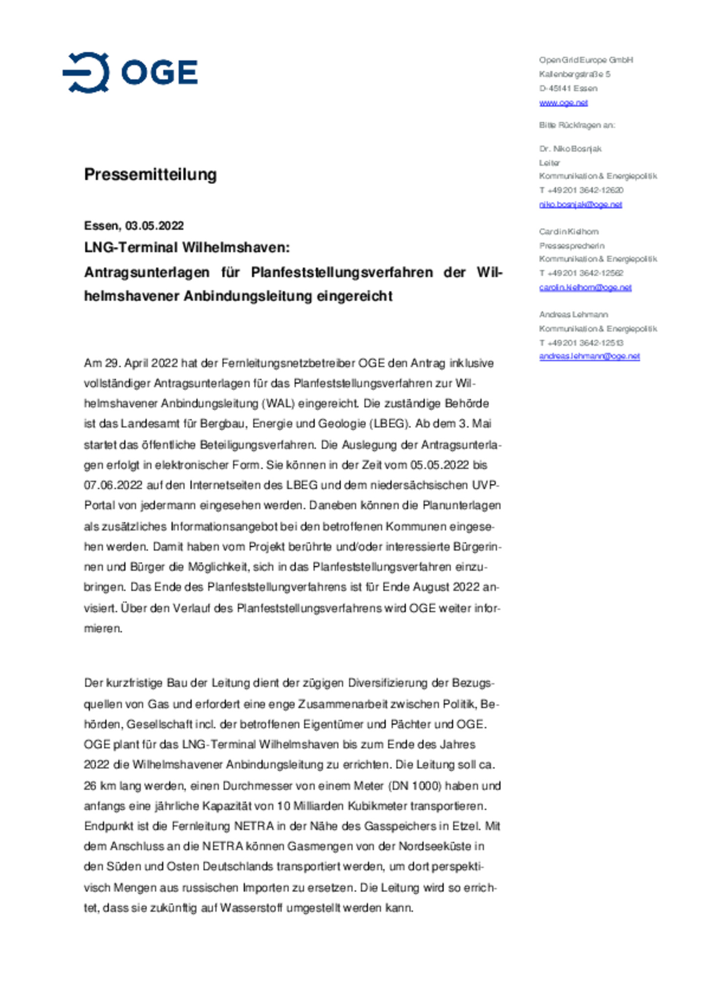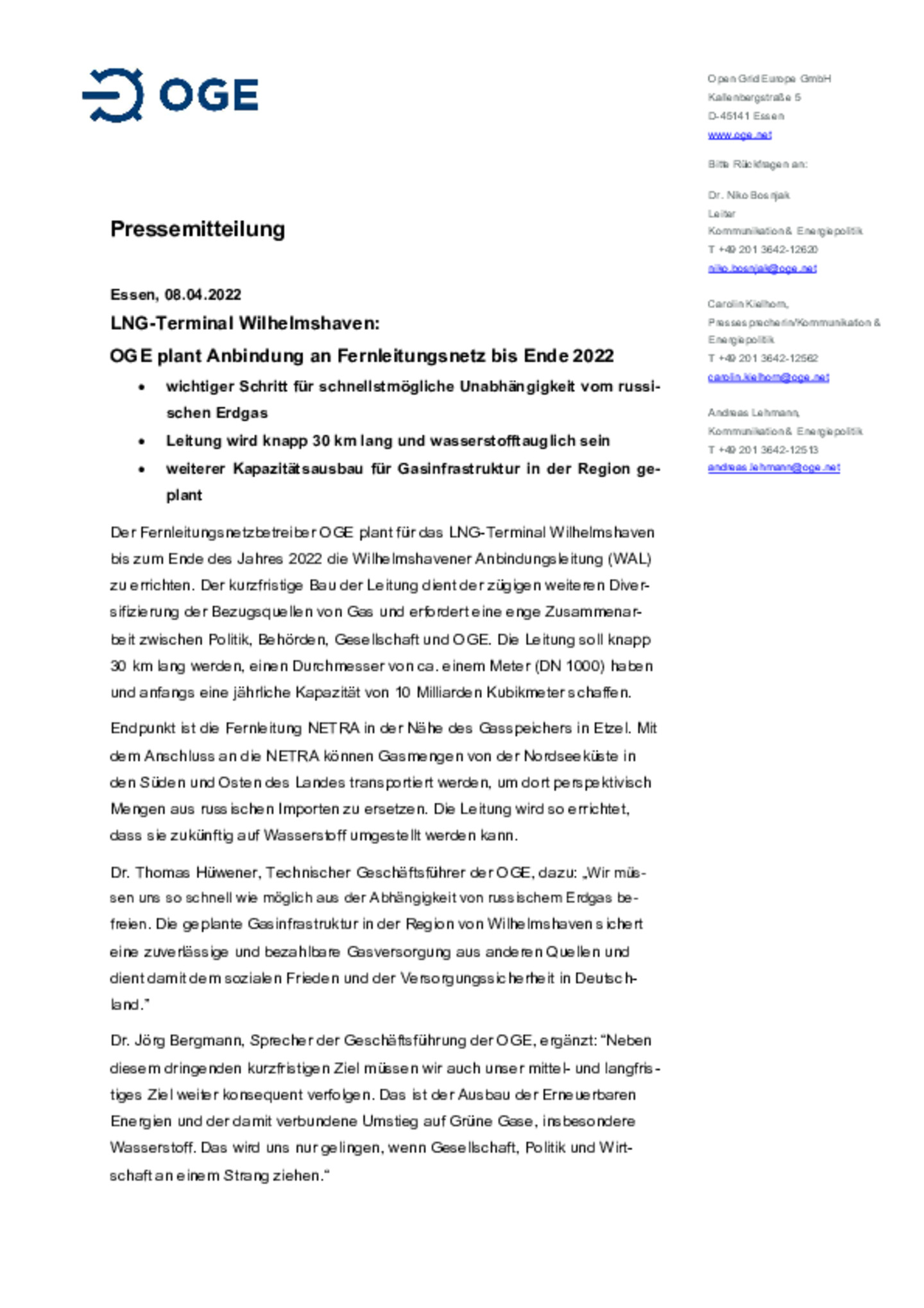 OGE, einer der führenden europäischen Fernleitungsnetzbetreiber, plant den Bau eines CO₂-Transportnetzes. Der Fokus liegt dabei auf CO₂-Emissionen, die im Produktionsprozess nicht vermieden werden k…önnen, sowie auf der Wiederverwendung von CO₂ in einem grünen, geschlossenen Kreislaufsystem zum Import von grünem Wasserstoff.