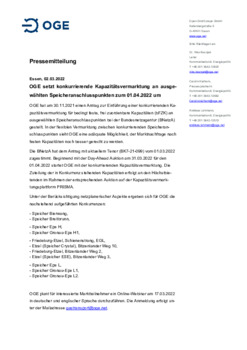 OGE setzt konkurrierende Kapazitätsvermarktung an ausgewählten Speicheranschlusspunkten zum 01.04.2022 um