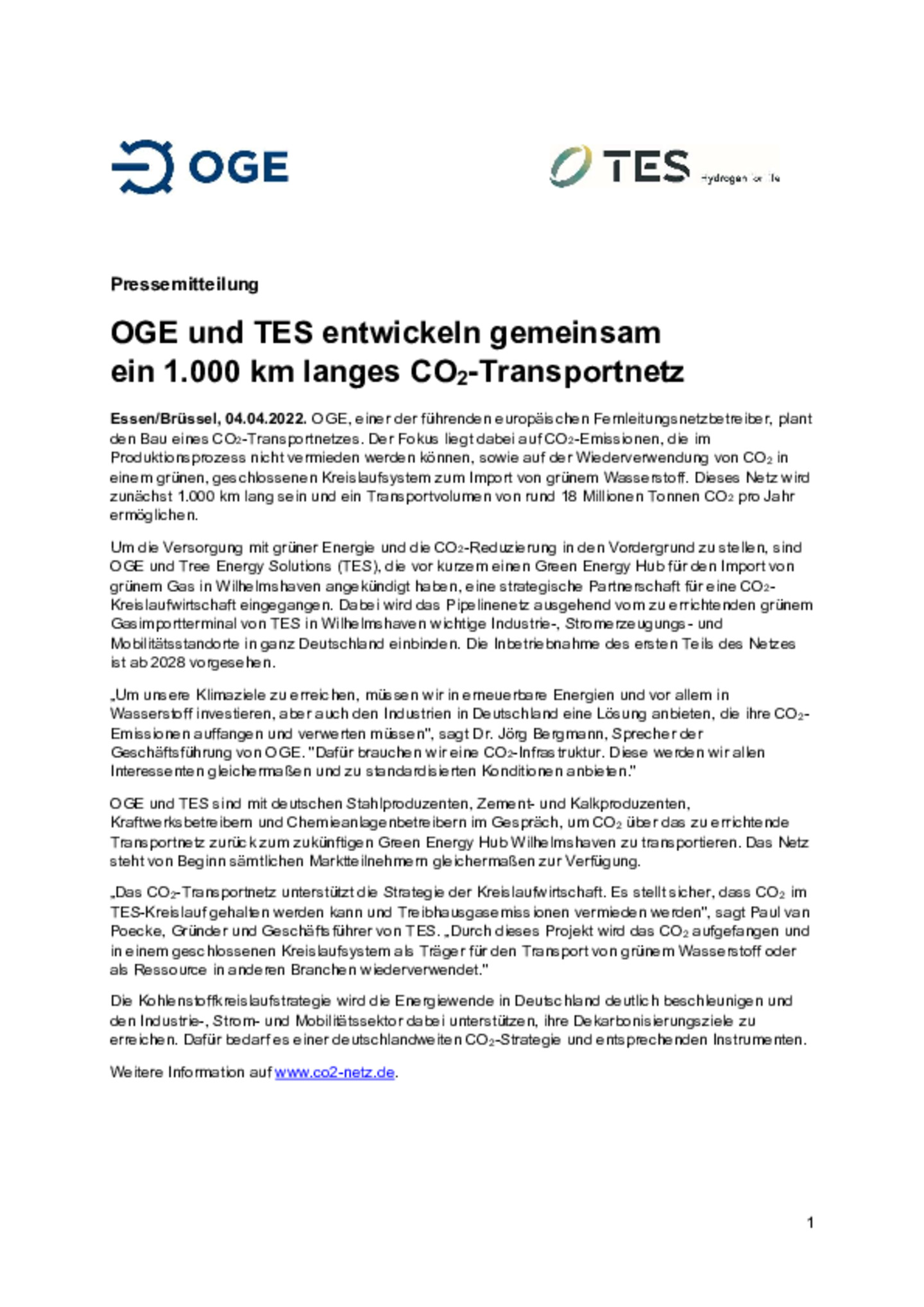 OGE und TES entwickeln gemeinsam ein 1.000 km langes CO₂-Transportnetz