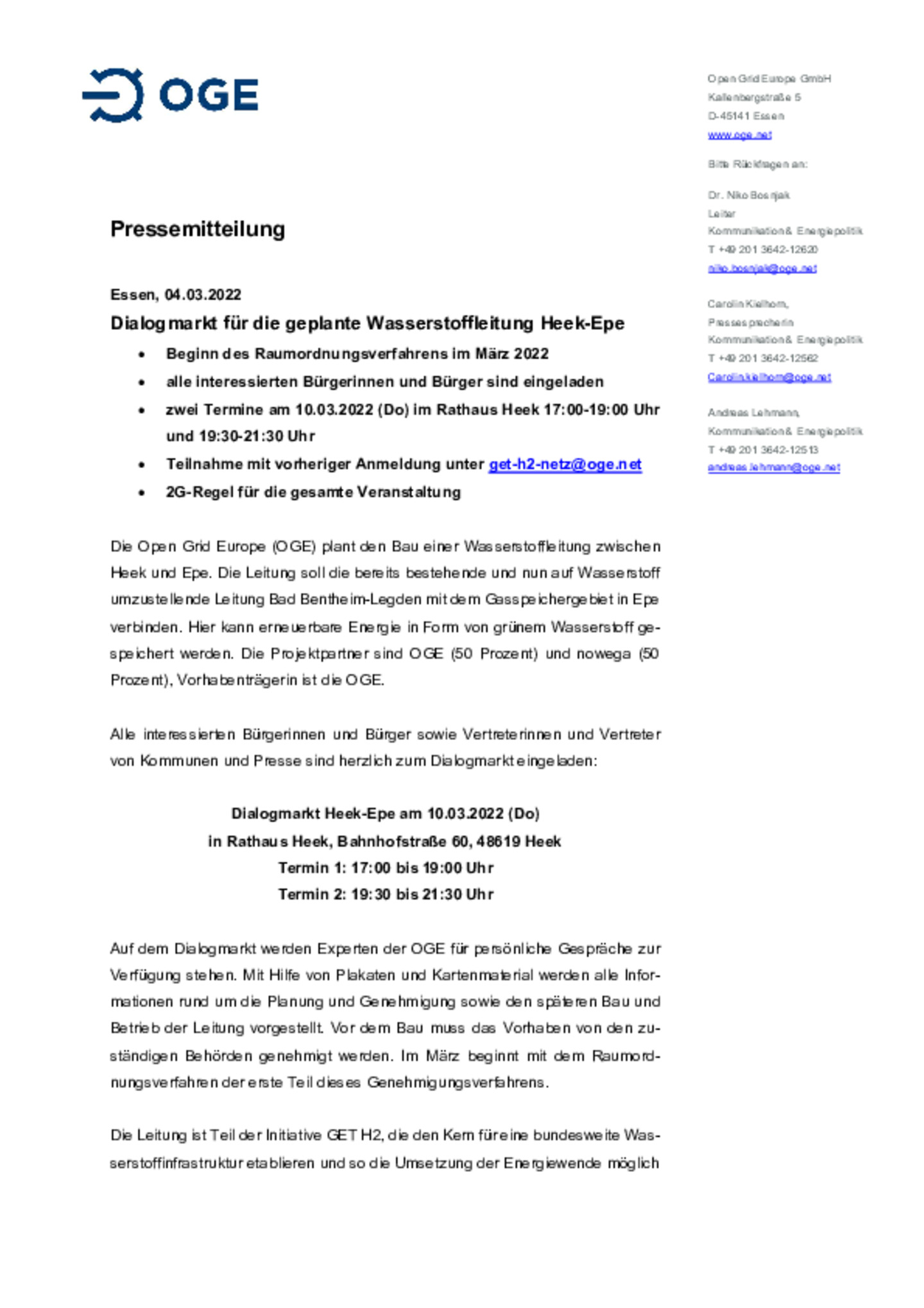 Die Open Grid Europe (OGE) plant den Bau einer Wasserstoffleitung zwischen Heek und Epe. Die Leitung soll die bereits bestehende und nun auf Wasserstoff umzustellende Leitung Bad Bentheim-Legden …mit dem Gasspeichergebiet in Epe verbinden.