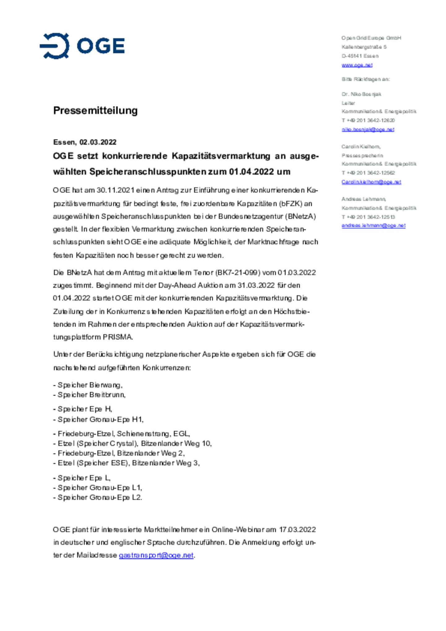 OGE setzt konkurrierende Kapazitätsvermarktung an ausgewählten Speicheranschlusspunkten zum 01.04.2022 um