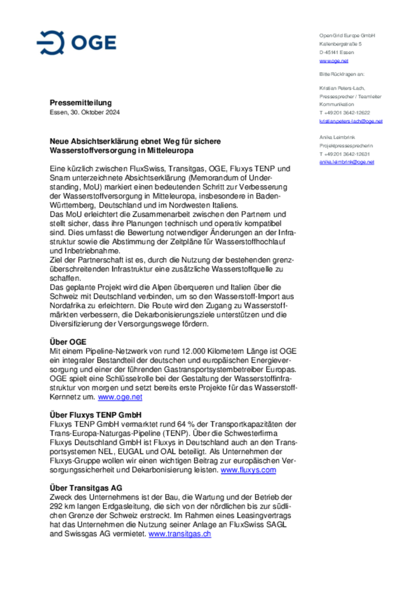 Eine kürzlich zwischen FluxSwiss, Transitgas, OGE, Fluxys TENP und Snam unterzeichnete Absichtserklärung markiert einen bedeutenden Schritt zur Verbesserung der Wasserstoffversorgung in Mitteleuropa…, insbesondere in Baden-Württemberg, Deutschland und im Nordwesten Italiens.
