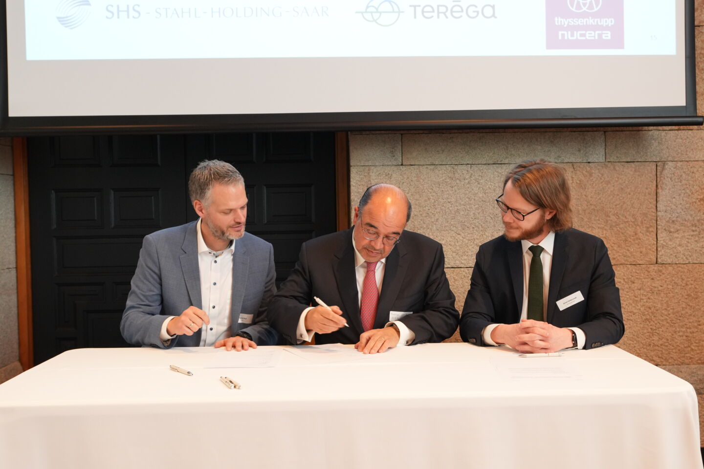 Nico Raß, Head of Business Developement Hydrogen International, Rodrigo Costa, CEO von REN und Simon Halberstadt, Executive Vice President Sales Develoement SEFE Enegrgy GmbH, unterzeichnen eine …gemeinsame Absichtserklärung, um den südwestlichen Importkorridor für Wasserstoff zu entwickeln.