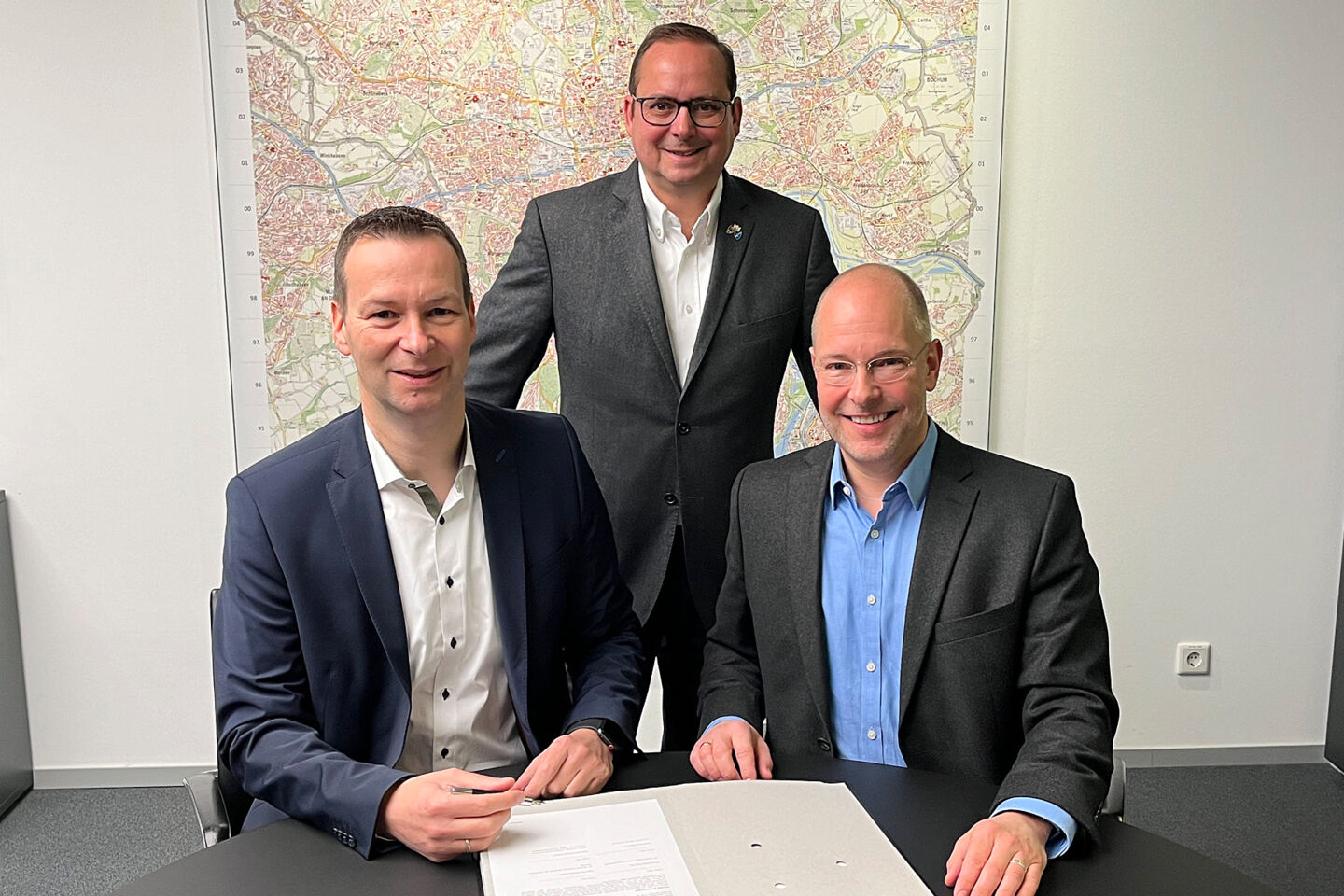 Unterzeichnen die Partnerschaftsvereinbarung: v. l. Dr. Thomas Hüwener, CEO von OGE, Thomas Kufen, Oberbürgermeister der Stadt Essen sowie Dr. Frank Pieper, Vorstandsvorsitzender der Stadtwerke Essen….