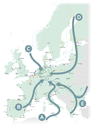 Es ist zu beachten, dass diese fünf Korridore mit den drei im REPower-EU-Plan dargestellten Korridoren, sowie seinen drei Importkorridoren übereinstimmen, darunter ein Korridor über das Mittelmeer (Korridore A und B), über die Nordsee (Korridor C) sowie über die Ukraine (Korridor E).
