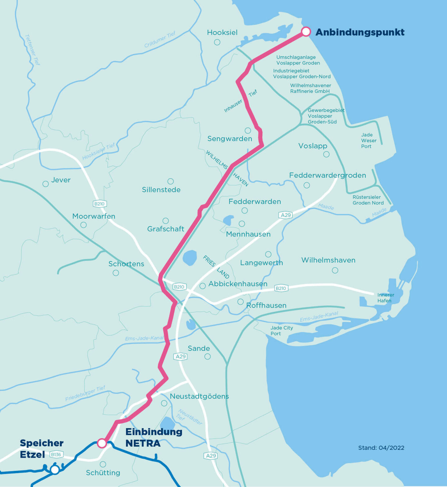Endpunkt ist die Fernleitung NETRA in der Nähe des Gasspeichers in Etzel. Mit dem Anschluss an die NETRA können Gasmengen von der Nordseeküste in den Süden und Osten des Landes transportiert werden, um dort perspektivisch Mengen aus russischen Importen zu ersetzen. Die Leitung wird so errichtet, dass sie zukünftig auf Wasserstoff umgestellt werden kann.