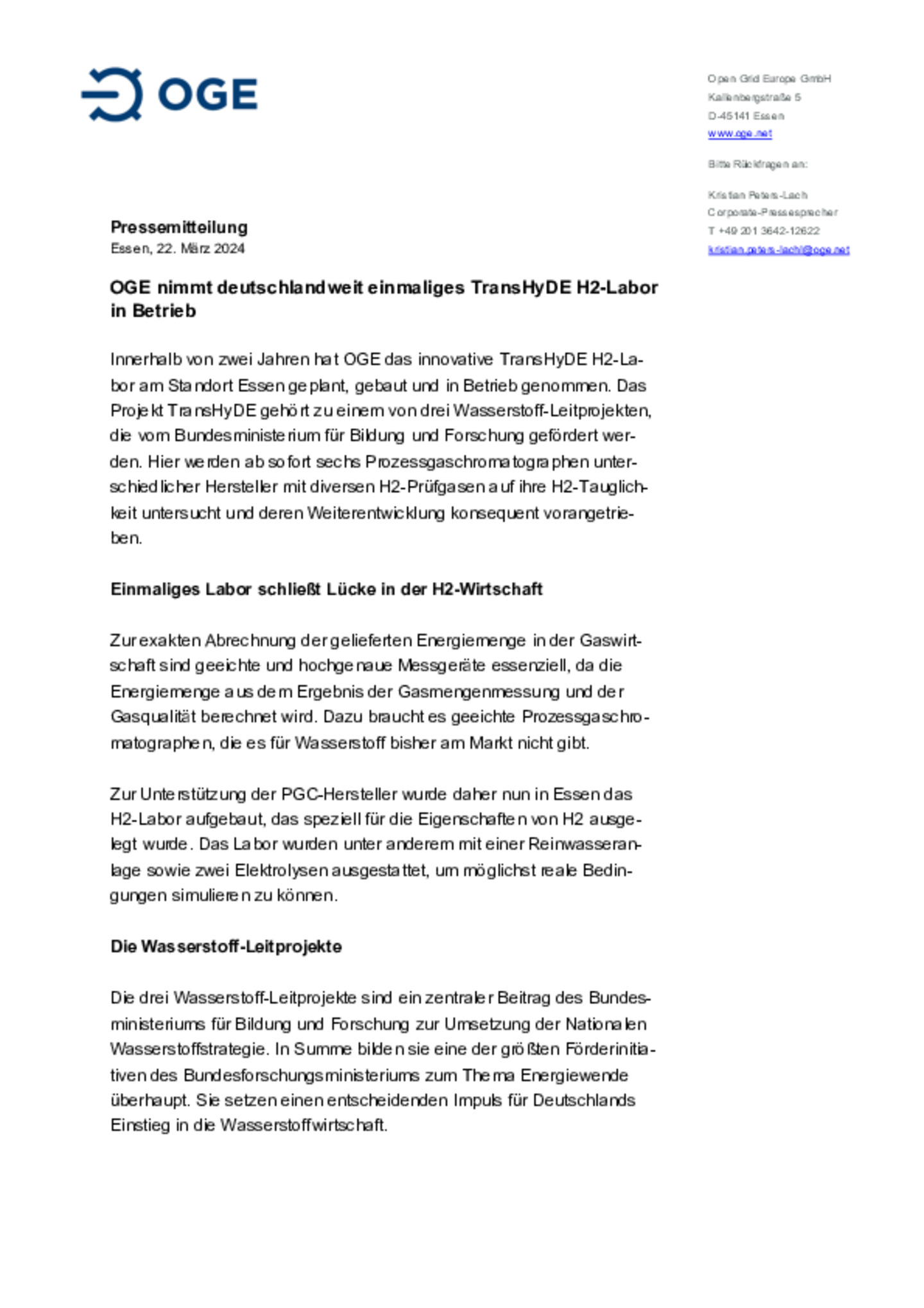 Innerhalb von zwei Jahren hat OGE das innovative TransHyDE H2-Labor am Standort Essen geplant, gebaut und in Betrieb genommen. Das Projekt TransHyDE gehört zu einem von drei Wasserstoff-Leitprojekten…, die vom Bundesministerium für Bildung und Forschung gefördert werden.