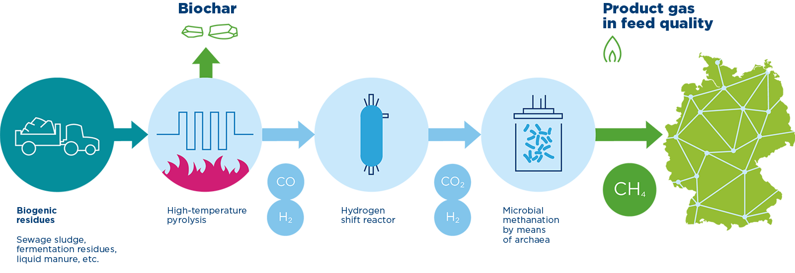The biogenic residues will be converted into biomethane by means of pyrolysis, followed by a purification stage for the raw gas produced, a water-gas shift reactor and a methanation unit.