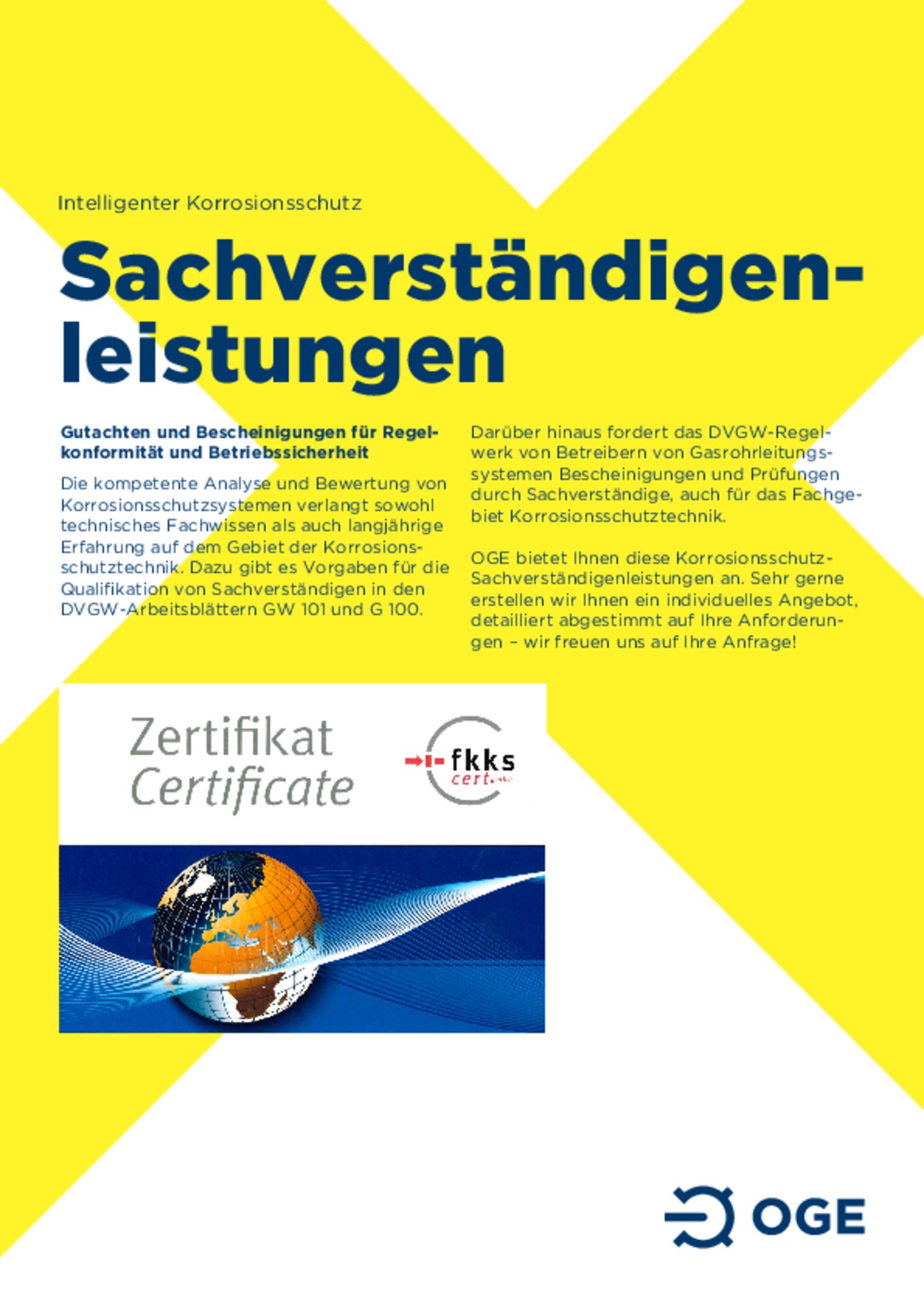 As a "corrosion protection pioneer", OGE is a specialist company certified to DVGW Code of Practice GW 11 which can support you in resolving your problems. The team includes experts accredited to DVGW Code of Practice GW 101, experts according to DIN EN 15257 Level 3 and Frosio-certified coating specialists.