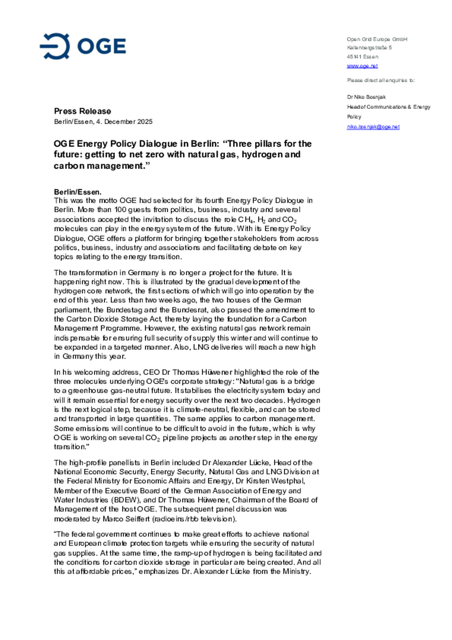 OGE Energy Policy Dialogue in Berlin: “Three pillars for the future: getting to net zero with natural gas, hydrogen and carbon management.”