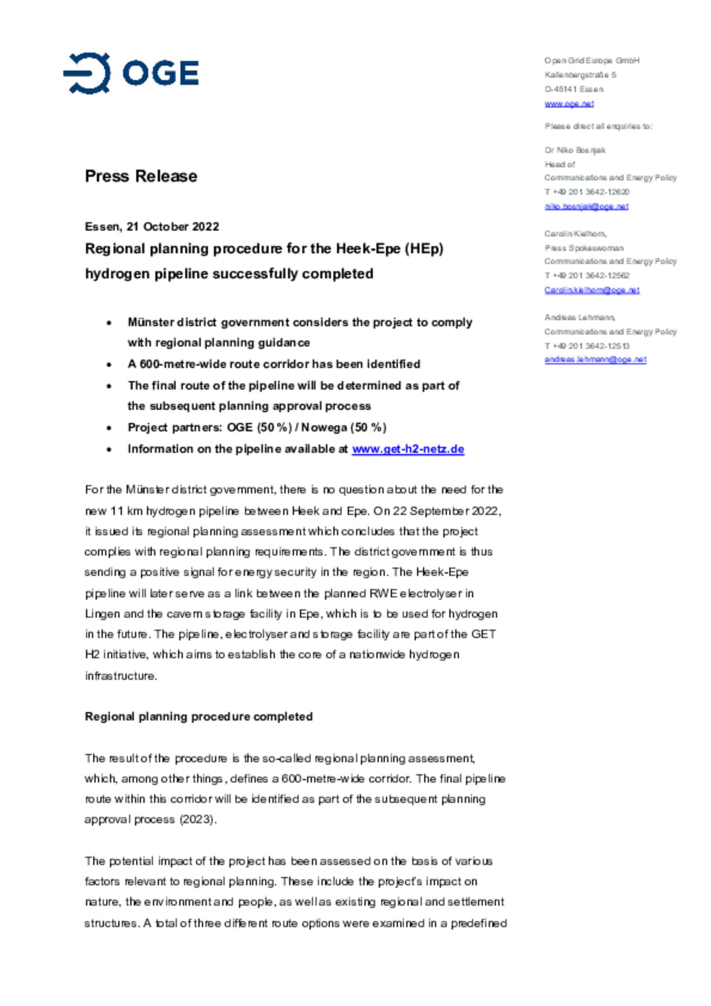 Regional planning procedure for the Heek-Epe (HEp) hydrogen pipeline successfully completed