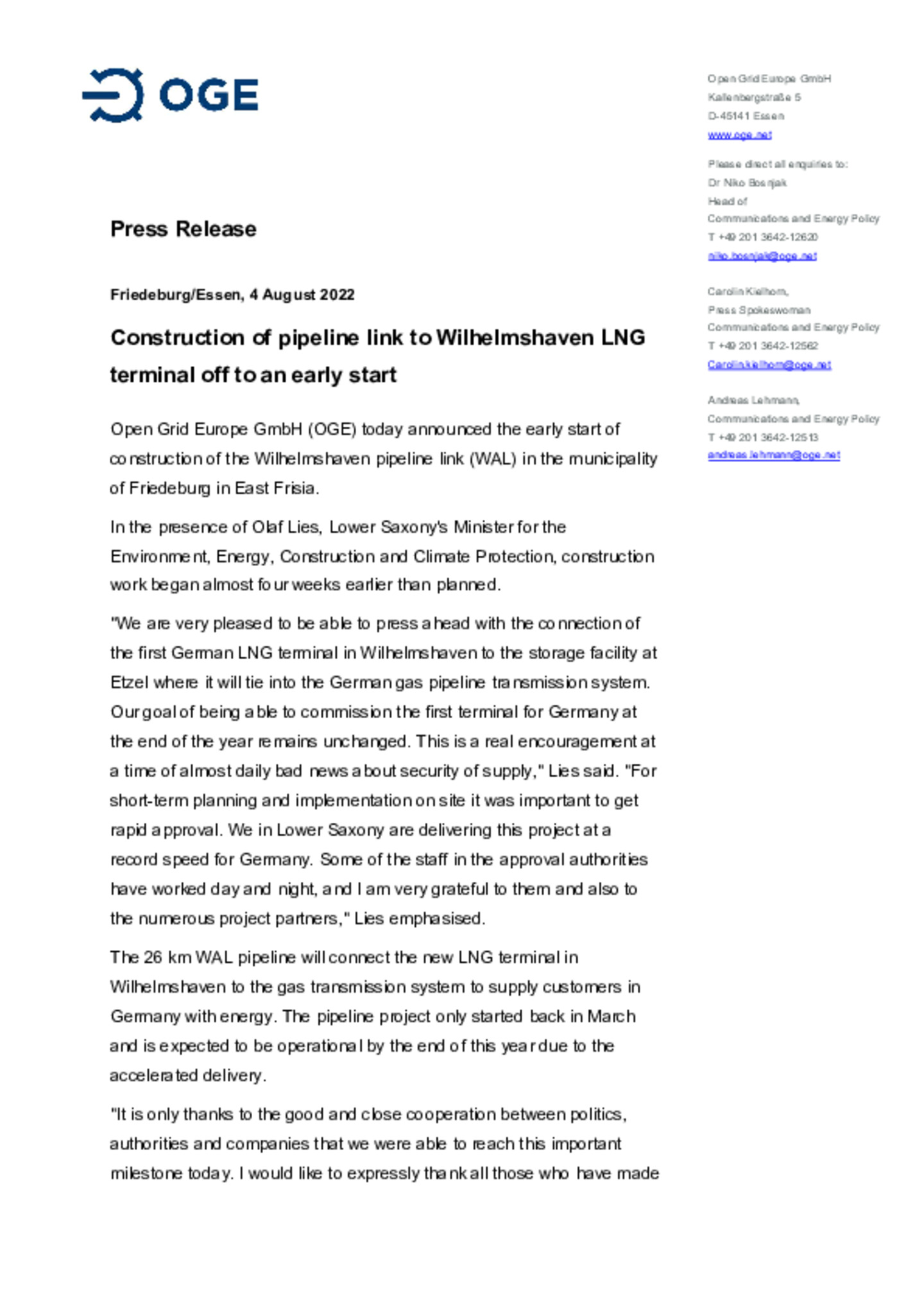 Münster district government considers the project to comply with regional planning guidance. A 600-metre-wide route corridor has been identified. The final route of the pipeline will be determined as… part of the subsequent planning approval process.