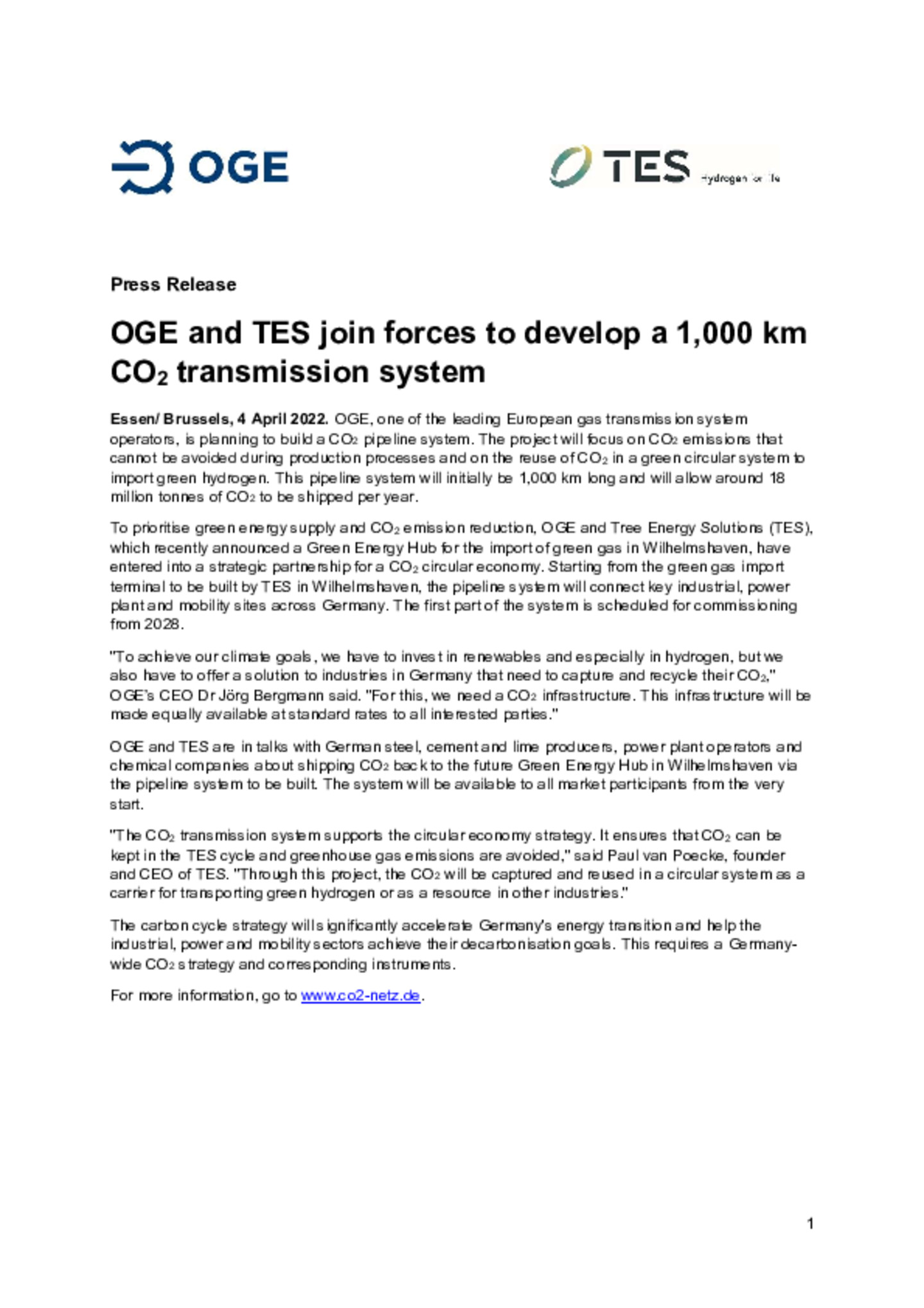 OGE and TES join forces to develop a 1,000 km CO₂ transmission system