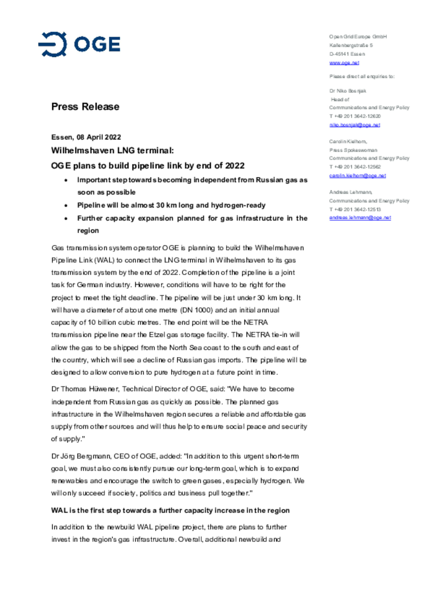 On 30 November 2021, OGE applied to the Federal Network Agency (BNetzA) for the introduction of competitive capacity marketing for conditionally firm freely allocable capacities (bFZK) at selected …storage connection points.