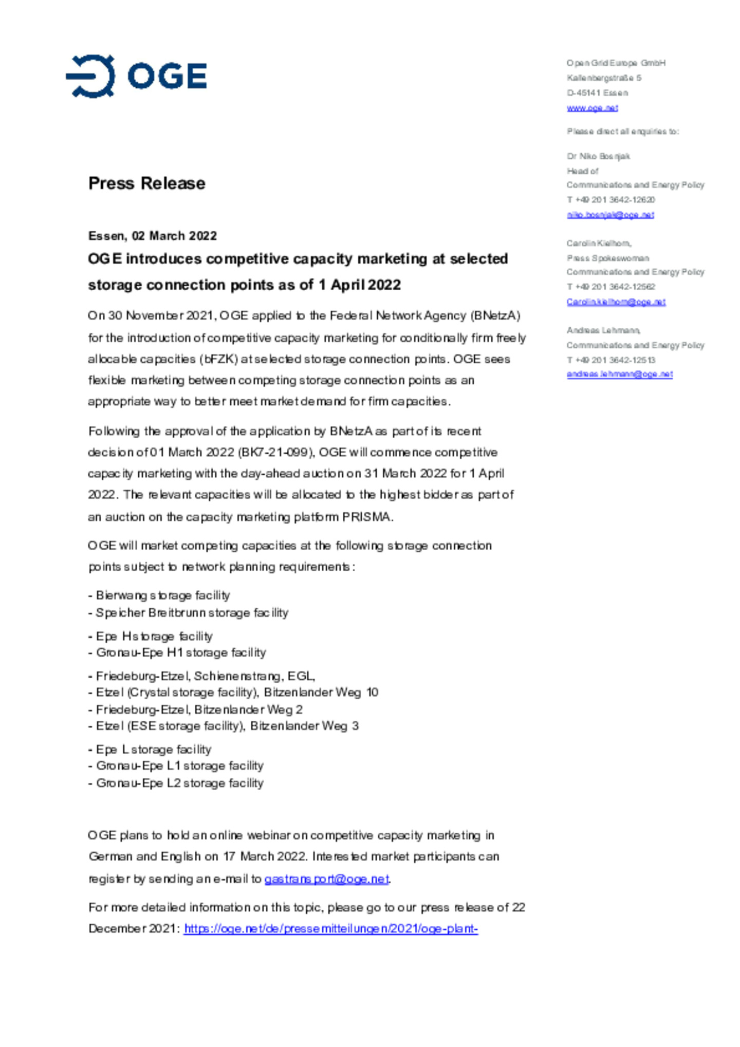 OGE introduces competitive capacity marketing at selected storage connection points as of 1 April 2022