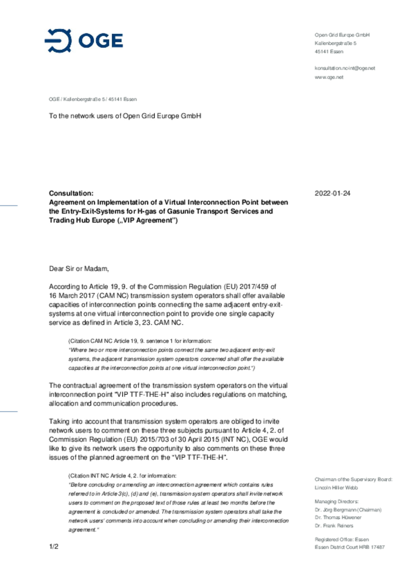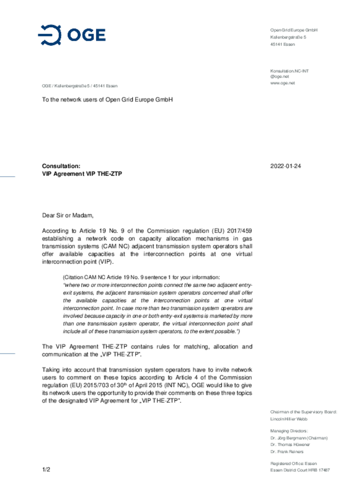 Price Sheet of Open Grid Europe GmbH for entry and exit contracts as well as internal orders in accordance with Cooperation Agreement XII in the market area Trading Hub Europe GmbH