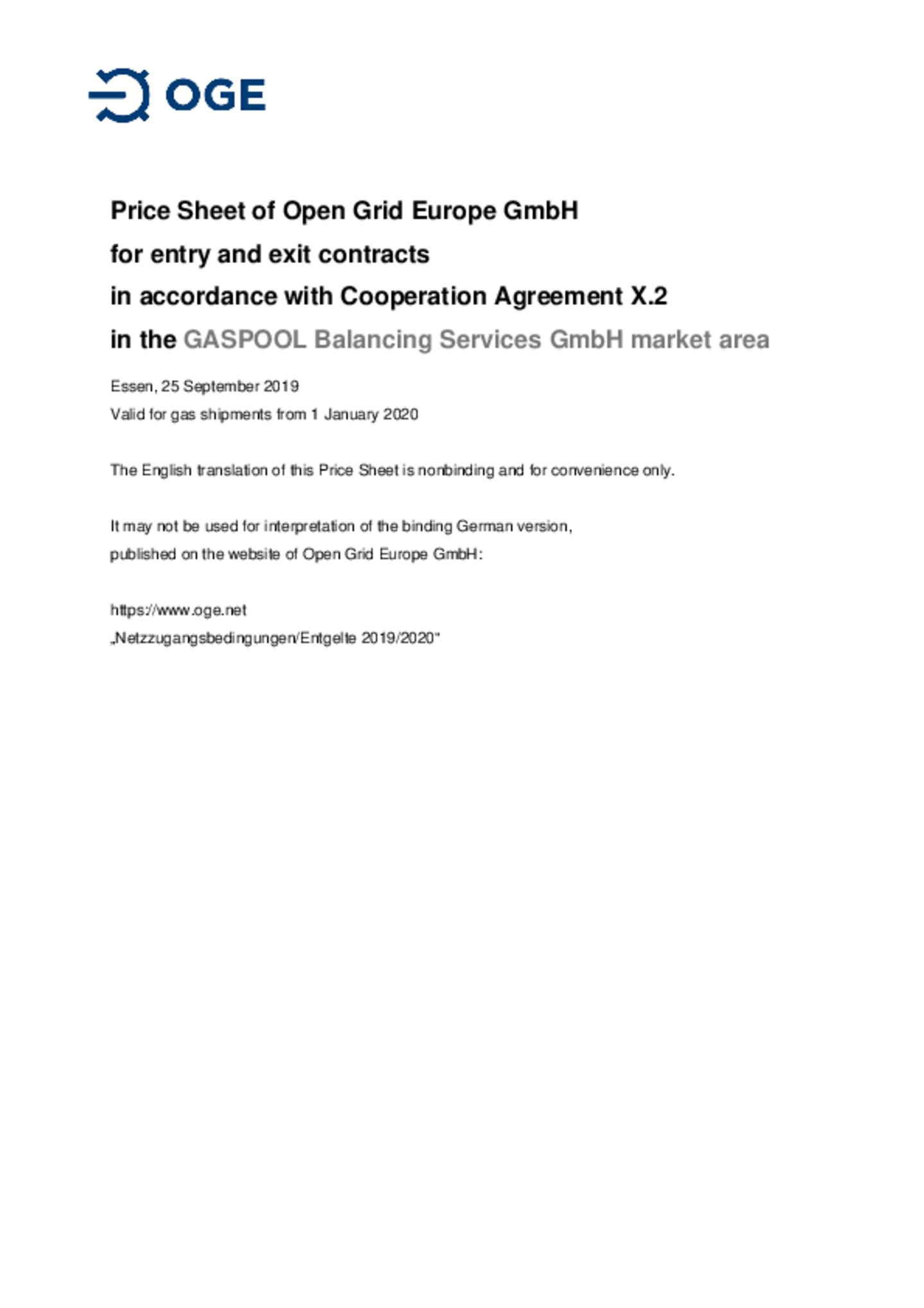 Price Sheet of Open Grid Europe GmbH for entry and exit contracts in accordance with Cooperation Agreement XI in the market area GASPOOL Balancing Services GmbH respectively Trading Hub Europe GmbH