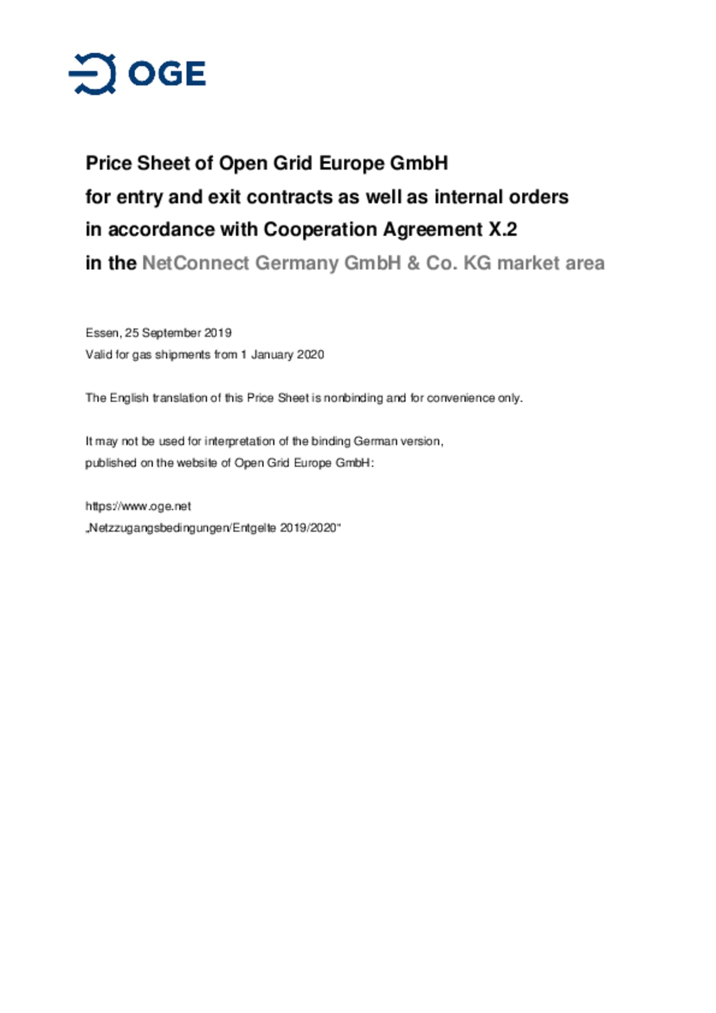 NCG Price sheet of Open Grid Europe GmbH 2020