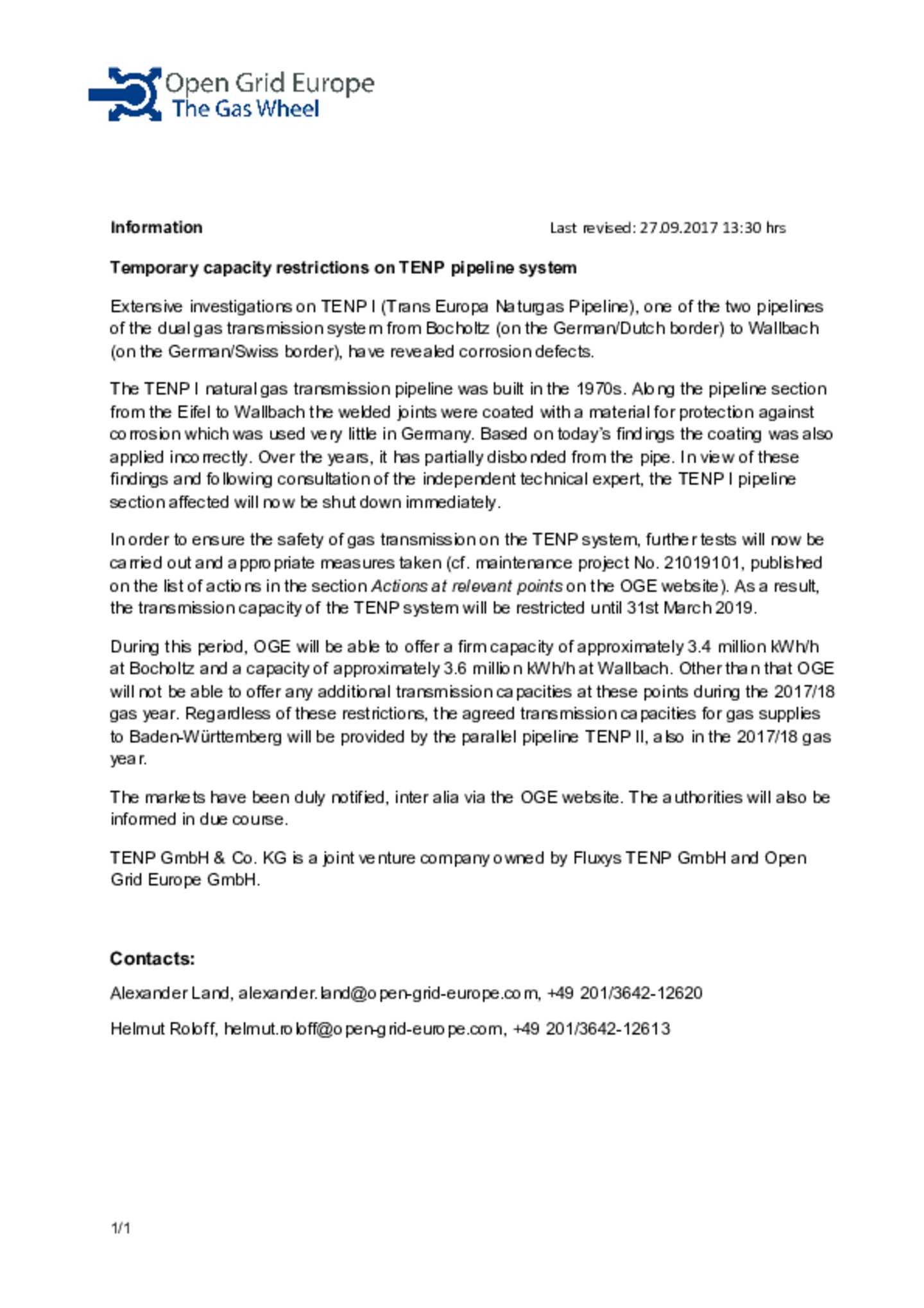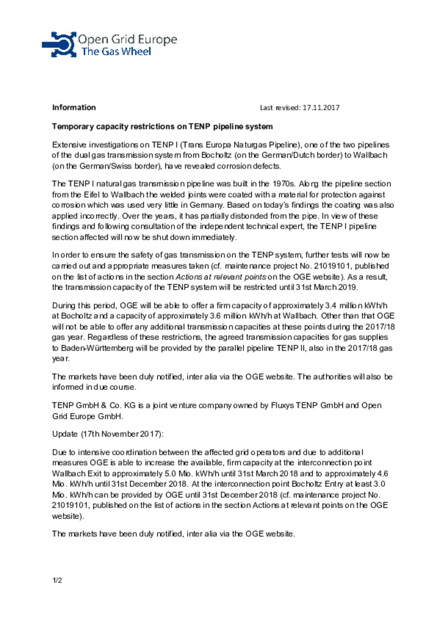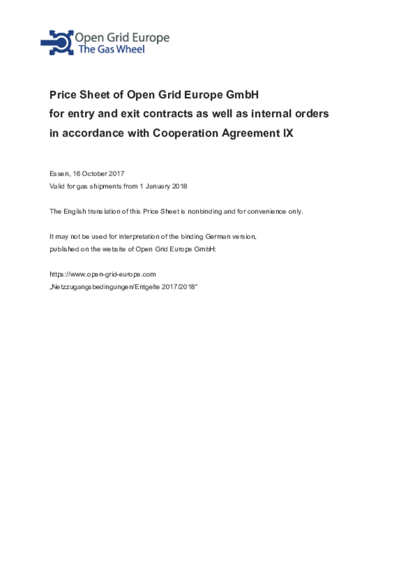 NCG Price sheet of Open Grid Europe GmbH 2017