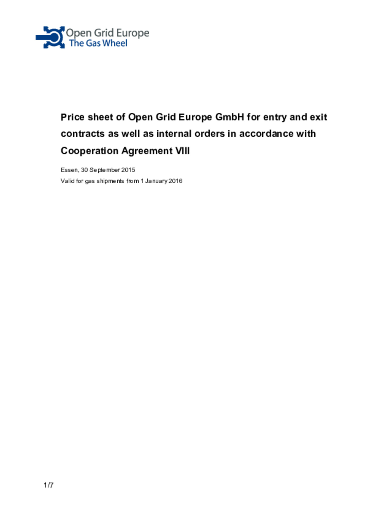 NCG Price sheet of Open Grid Europe GmbH 2016