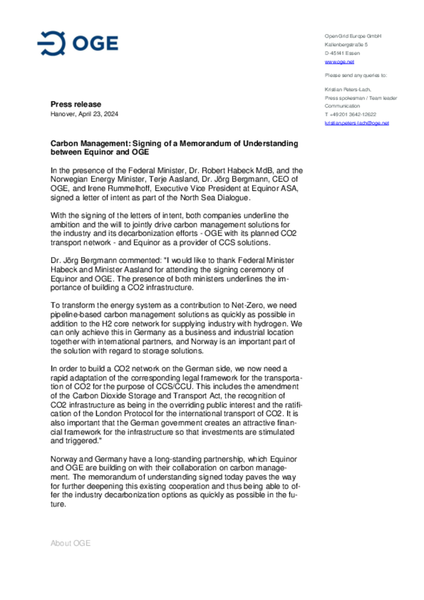 Carbon Management: Signing of a Memorandum of Understanding between Equinor and OGE