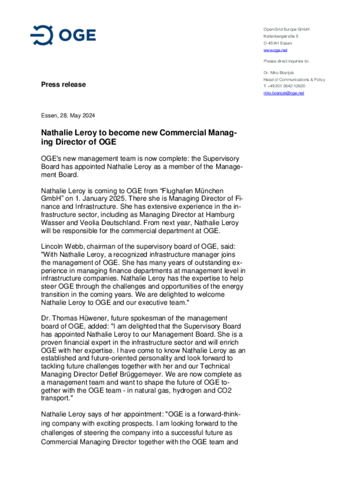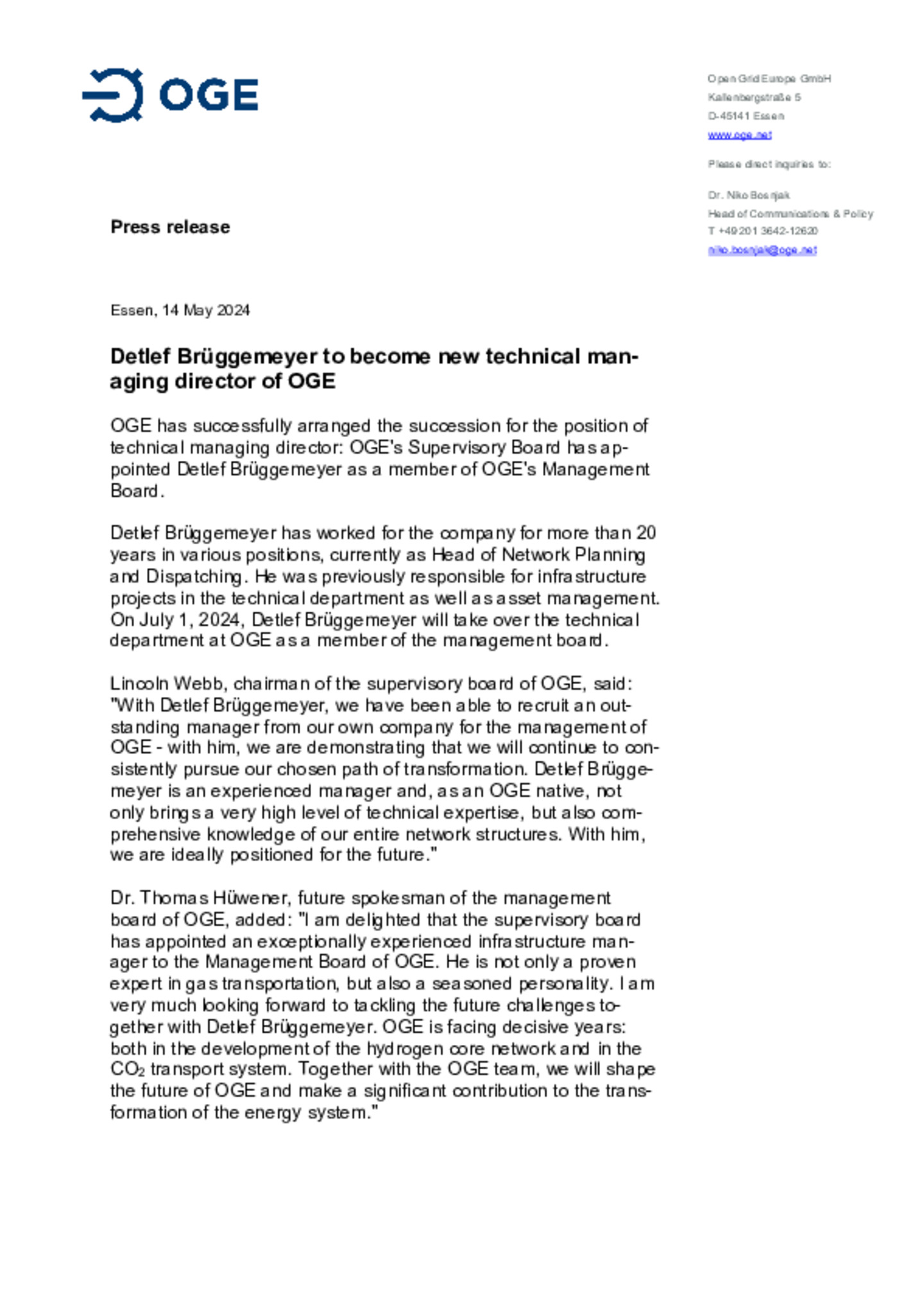 OGE has successfully arranged the succession for the position of technical managing director: OGE's Supervisory Board has appointed Detlef Brüggemeyer as a member of OGE's Management Board.