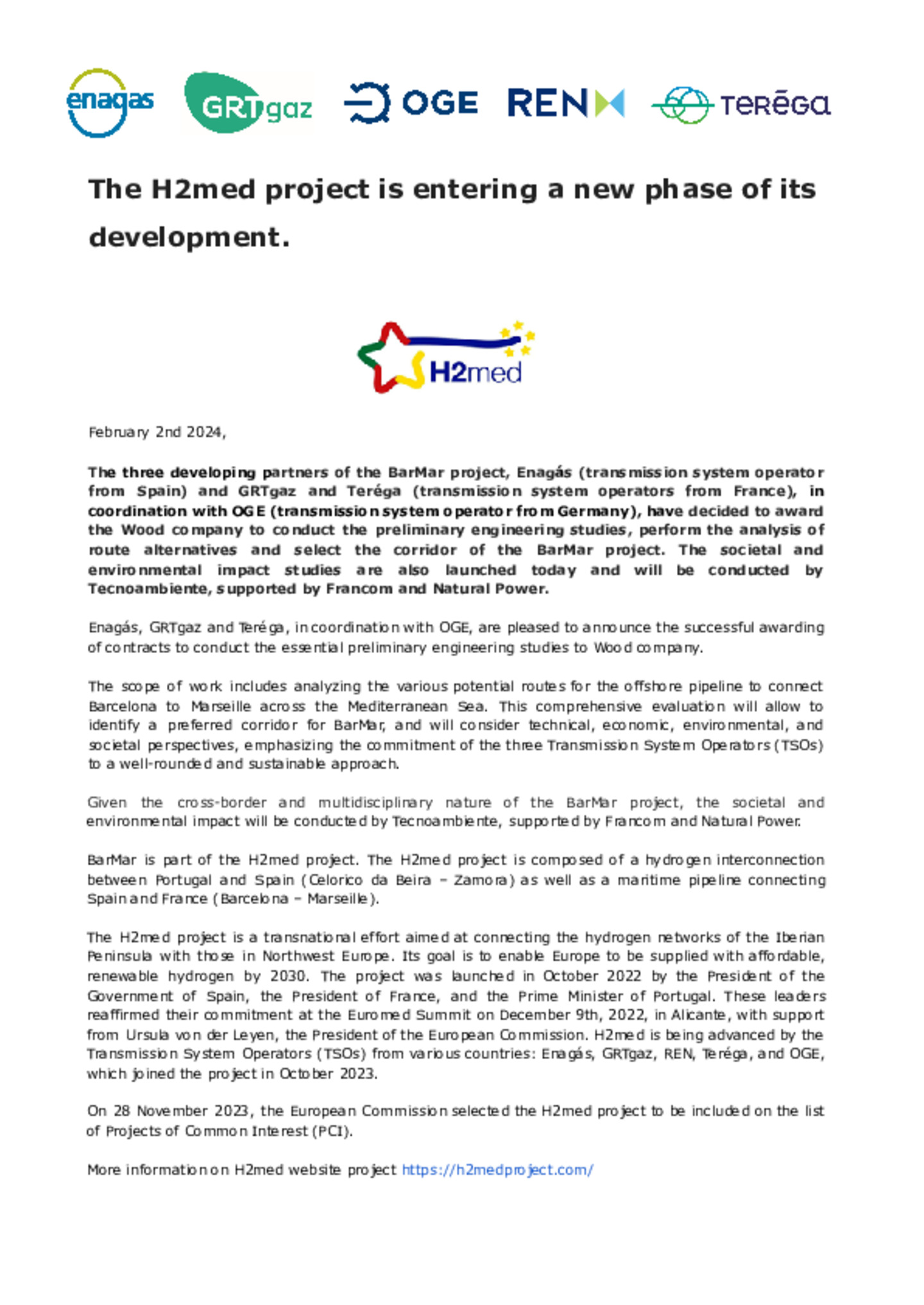 The three developing partners of the BarMar project, Enagás and GRTgaz and Teréga , in coordination with OGE, have decided to award the Wood company to conduct the preliminary engineering studies, …perform the analysis of route alternatives and select the corridor of the BarMar project.