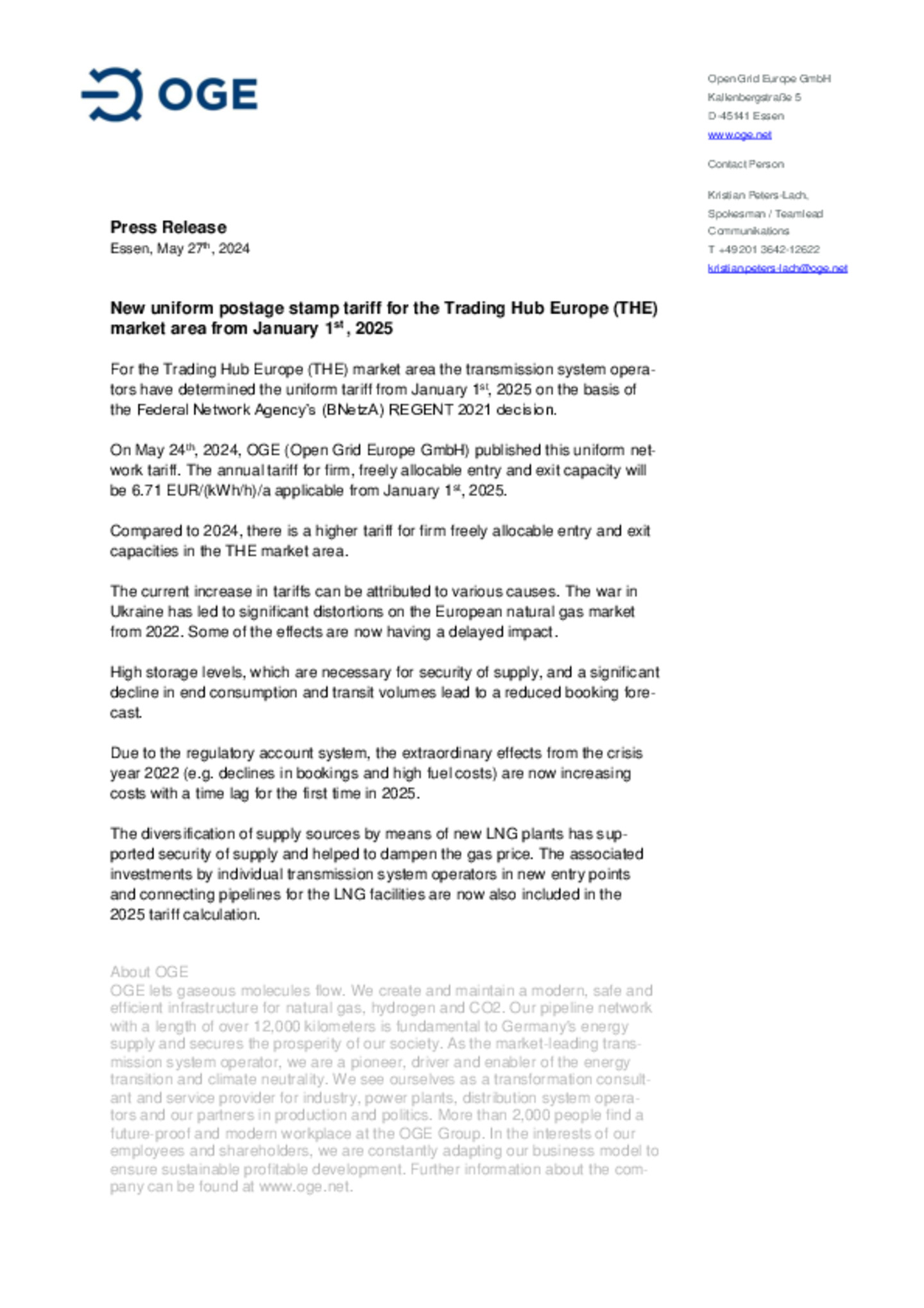 For the Trading Hub Europe (THE) market area the transmission system operators have determined the uniform tariff from January 1st, 2025 on the basis of the Federal Network Agency’s (BNetzA) REGENT …2021 decision.