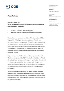 This week saw the successful completion of the final weld on NETG's Voigtslach-to-Paffrath gas transmission pipeline in Paffrath near Leverkusen. Following acceptance by TÜV as the supervisory …authority, the pipeline has now achieved technical completion and operational readiness as part of Germany's high-pressure gas transmission system.
