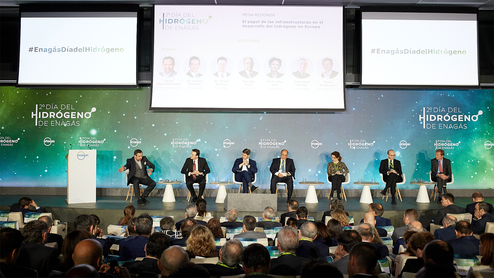 f. l. t. r. Jorgo Chatzimarkakis (moderator), Hydrogen Europe; Arturo Gonzalo, Enagas; Frank Reiners, OGE; Rodrigo Costa, REN; Maria Rita Galli, DESFA; Dominique Mockly, Terega; Pierre Duvieusart, GRTgaz