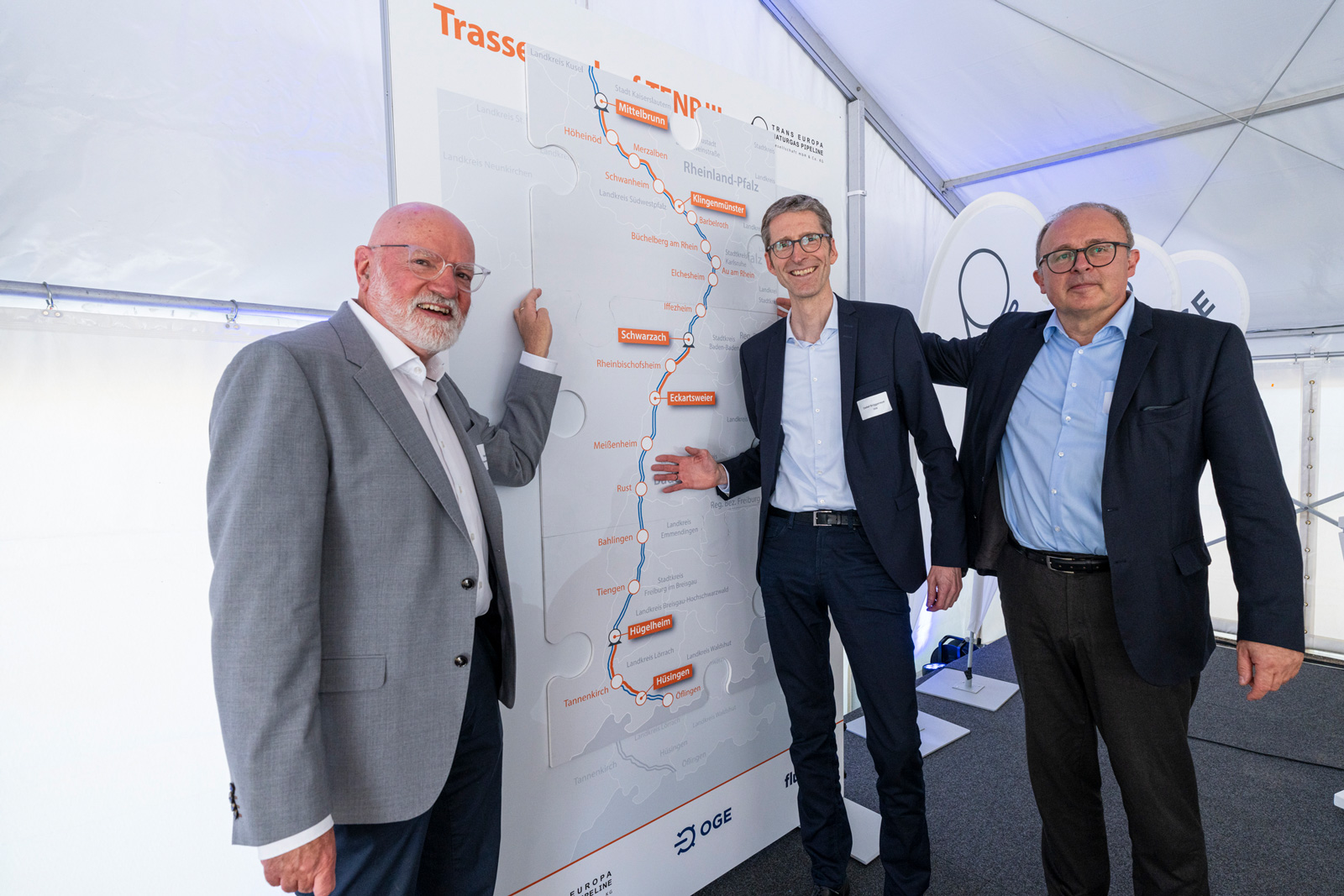 Symbolically assembled the three construction phases of TENP III (from left to right): Klemens Ficht (Vice President of the Freiburg Government), Detlef Brüggemeyer (Managing Director of OGE), Gérard Kimus (Managing Director of Fluxys TENP).